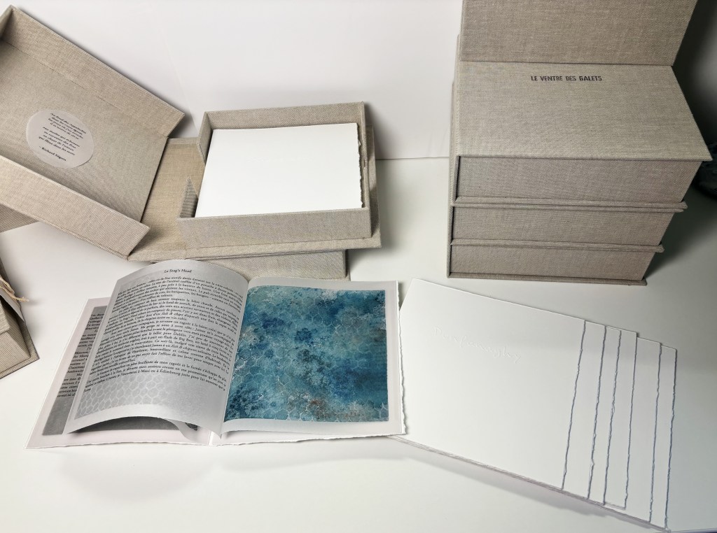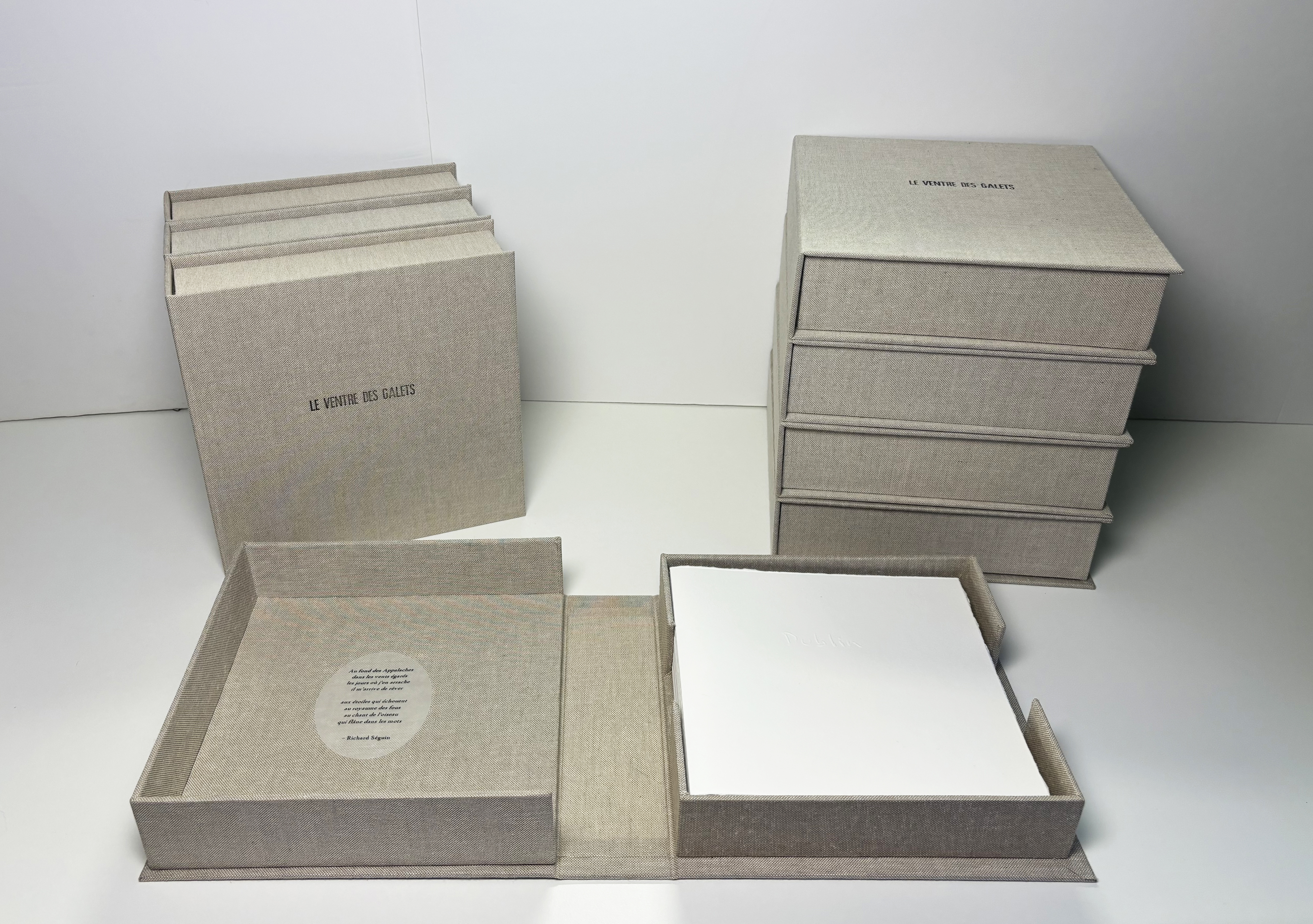 Les huit exemplaires de mon livre d’artiste « Le ventre des galets » sont enfin complétés. Merci à Sébastien Lavoie qui m’a accompagné lors de la réalisation des boîtiers et qui m’a partagé son savoir précieux sur la reliure et le livre d’artiste. Aussi, un énorme merci à Sophie Létourneau sans qui cette histoire serait restée une ébauche dans un tiroir. Après des semaines (mois? années?) de travail acharné, voici le résultat:
