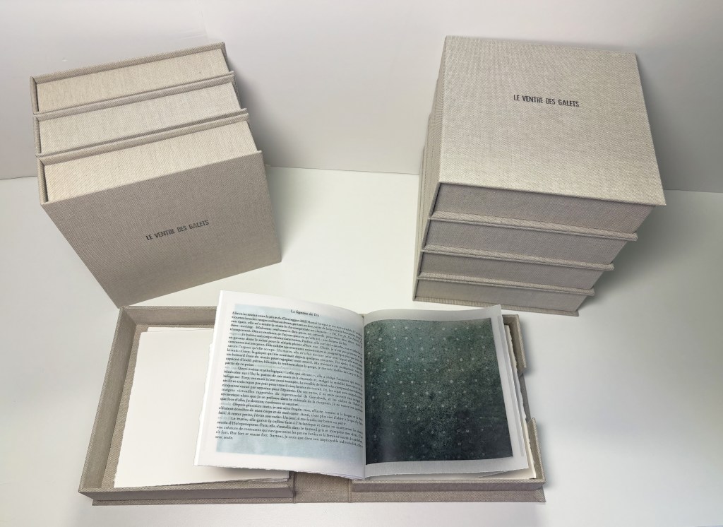 The eight copies of my artist’s book “Le ventre des galets” are finally completed. Thank you to Sébastien Lavoie who accompanied me during the creation of the book and who shared his precious knowledge on binding and artist’s books. Also, a huge thank you to Sophie Létourneau without whom this story would have remained a draft in a drawer. After weeks (months? years?) of hard work, here is the result: