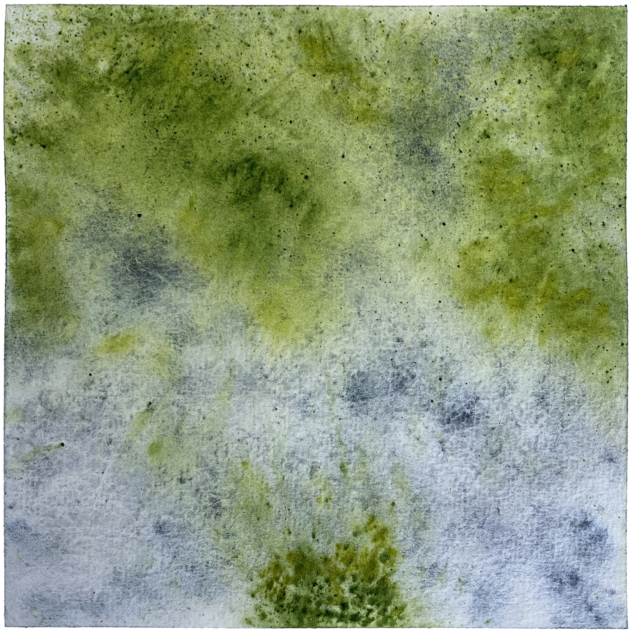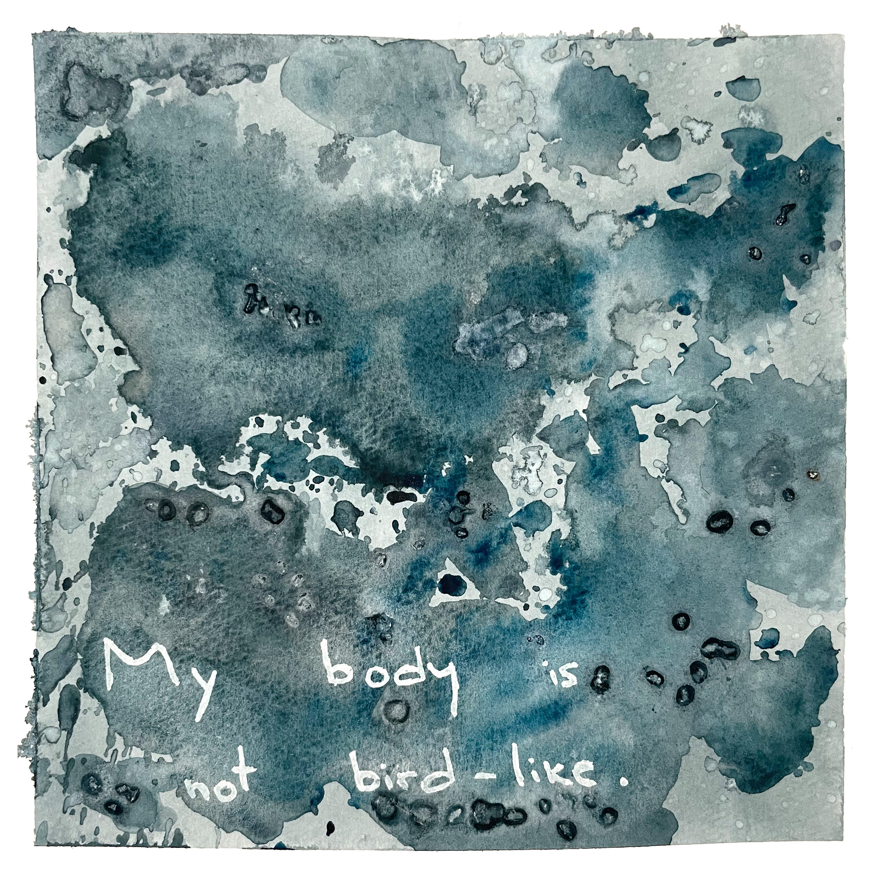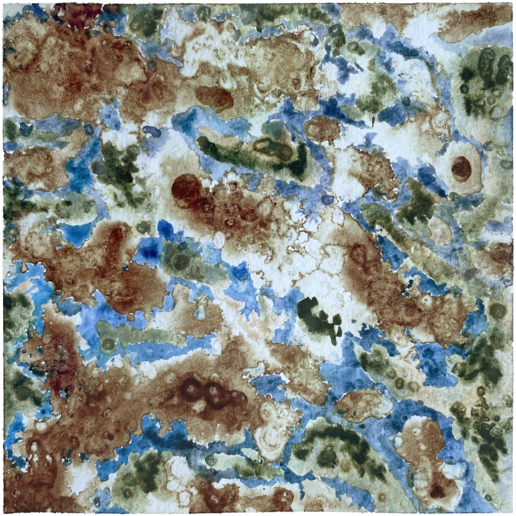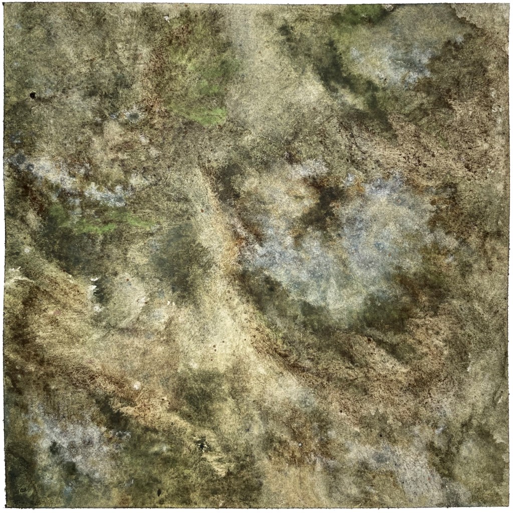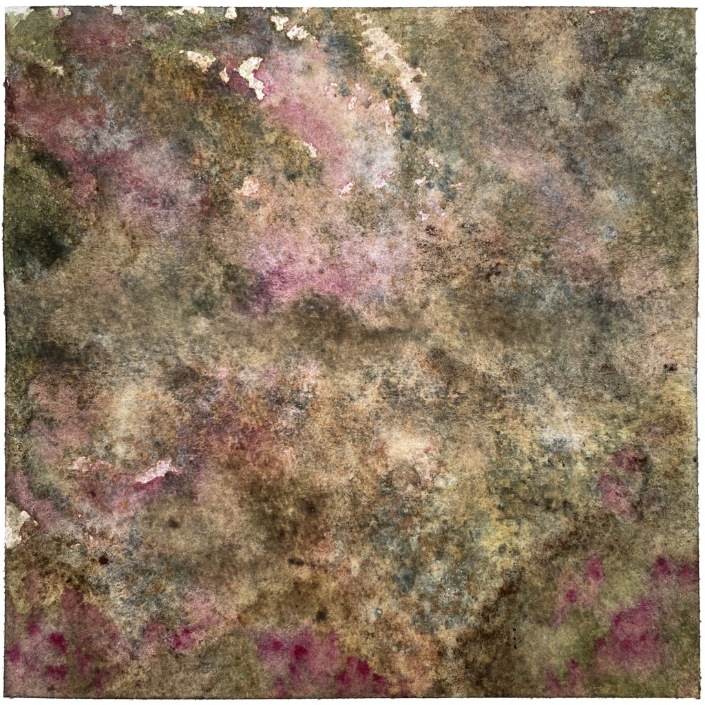 Watercolour and cold-pressed paper – exhibition in the form of a mosaic and installation. Many of these 6″ by 6″ watercolours were reproduced on vellum paper in the artist’s book “Le ventre des galets” (SCW, 2023). All quotes come from Max Porter’s novel “Grief is the Thing with Feathers” (2015).