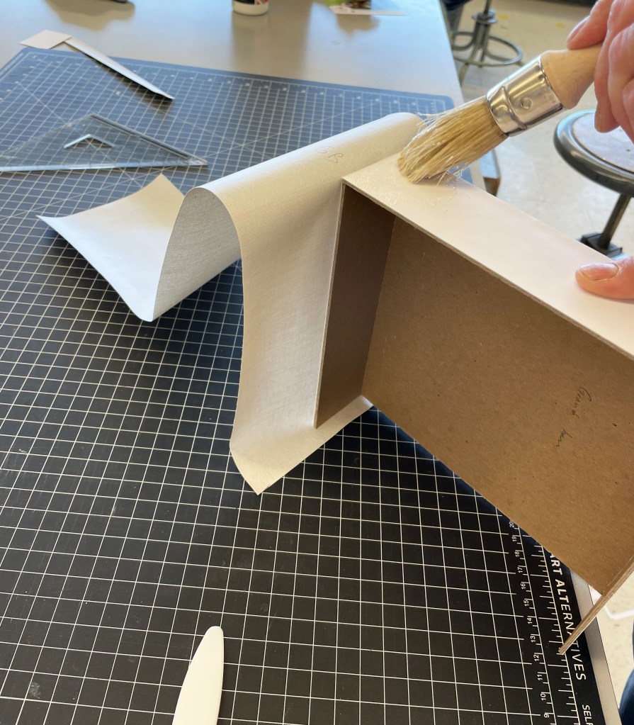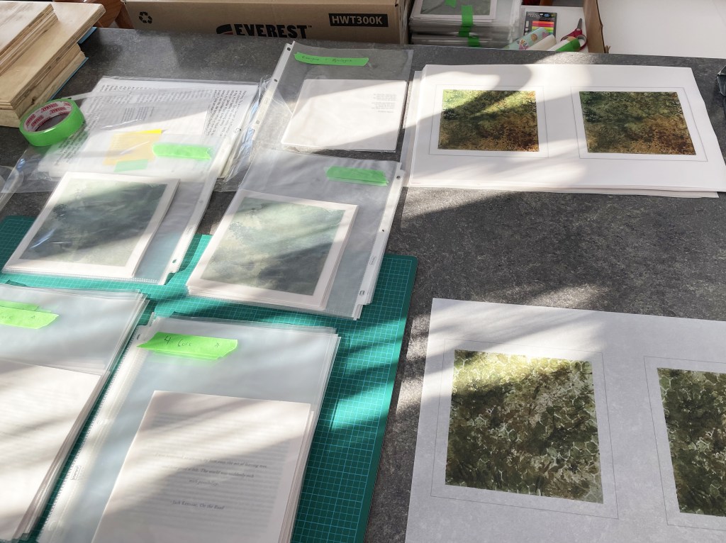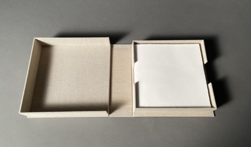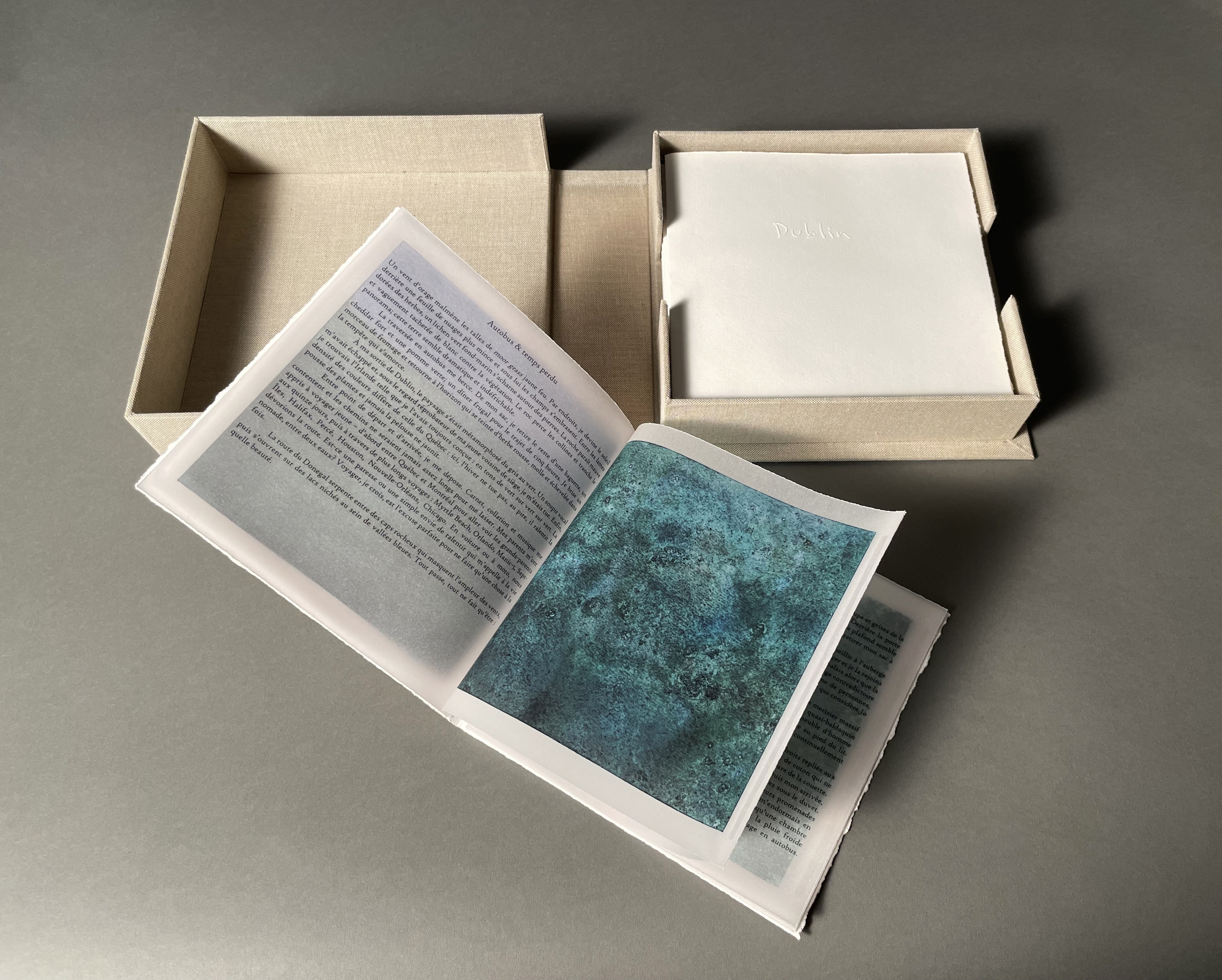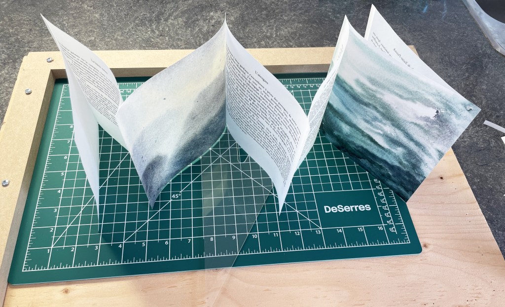 This artist’s book was written and crafted between 2021 and 2023 as part of a master’s degree in research-creation in literature at Laval University. Le ventre des galets is a nonficiton narrative and an artist’s book presented in eleven notebooks in a canvas case. Watercolours and non-fiction fragments intertwine through eleven vellum accordions to evoke memories of travels and mourning. By. uniting expressive art and literary fragments, the artist highlights the power of words as well as their limit in the face of the uncontrollable. Techniques: hand-made two-part case, hot stamping, photoengraving, cold stamping, watercolor, digital photography and laser printing on vellum. Materials: cardboard, binding cloth, BFK Rives white etching paper, vellum, Gudy glue. Dimensions: 22 cm x 48 cm x 6 cm. Eight copies were made and two copies were acquired by the Bibliothèque des Archives nationales du Québec (BAnQ) in 2024.