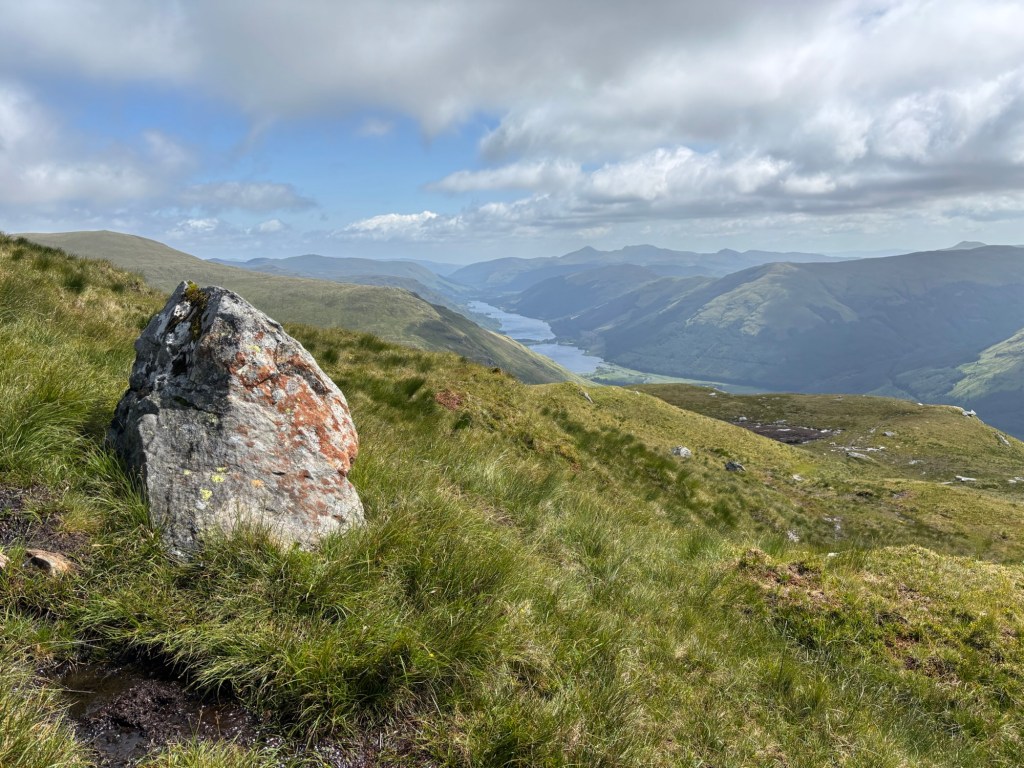 The climb from Inverlochlarig is quite steep. The side of Beinn Tulaichean is covered in bracken, and the “path” wasn’t easy to spot or follow. I was nervous, « in my head », and insecure, and I climbed too fast. After three-quarters of an hour, I felt nauseous. I walked with nausea for a little over an hour, but eventually had to stop and wait for my breakfast bar to settle in my stomach. In all of this, I was lucky, because two hikers got ahead of me while I was resting. I followed their progress from my rock, and they traced the path to the summit (what a good life).