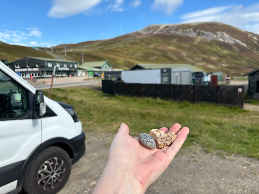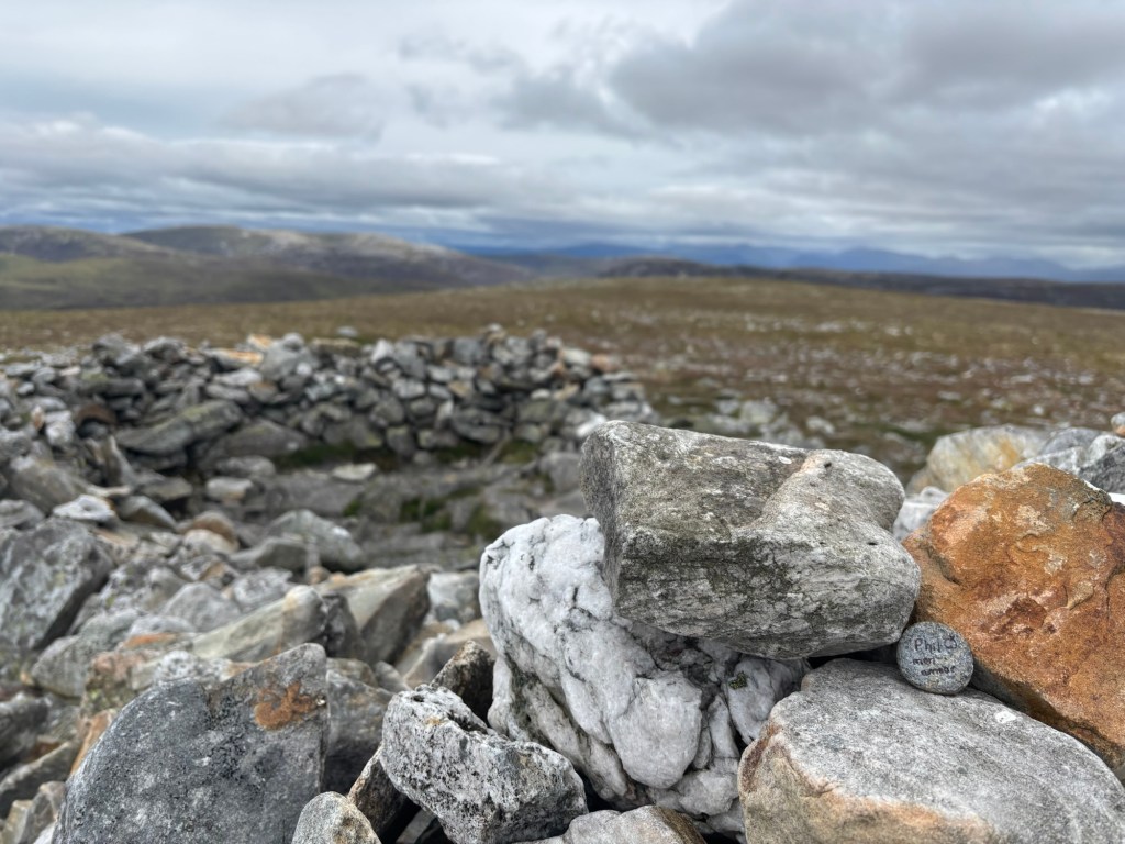 The second peak, Càrn a’Ghèoidh, is further from the ski resort. The walk to reach it is gentle. I spent the day with two new friends: a joyful hiker and a small dog (Buddy the enthusiastic stone catcher). What wonderful conversations—their presence was an unexpected gift and added a special depth to the stones I placed on the summits. I dedicated these mountains to my wellness ecosystem at home: my partner and our two kitties, Obie and Ezio.