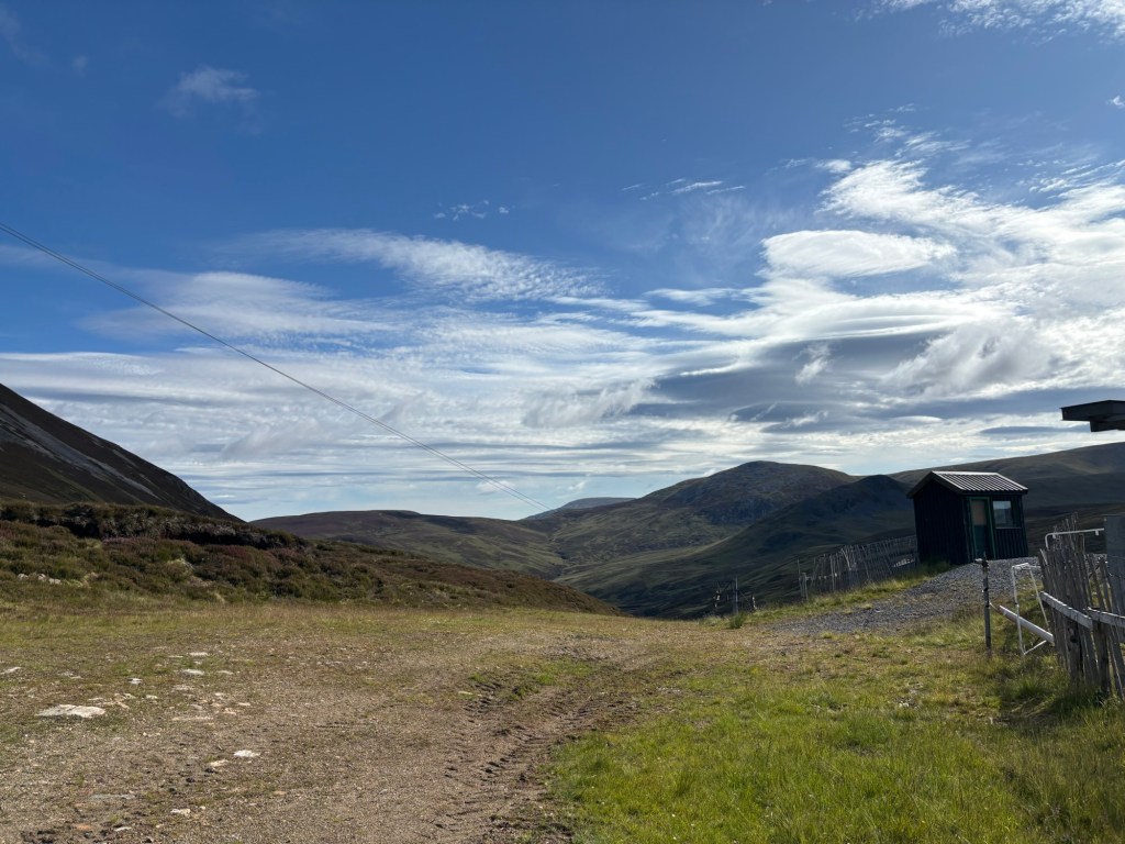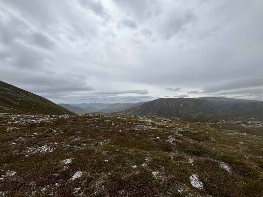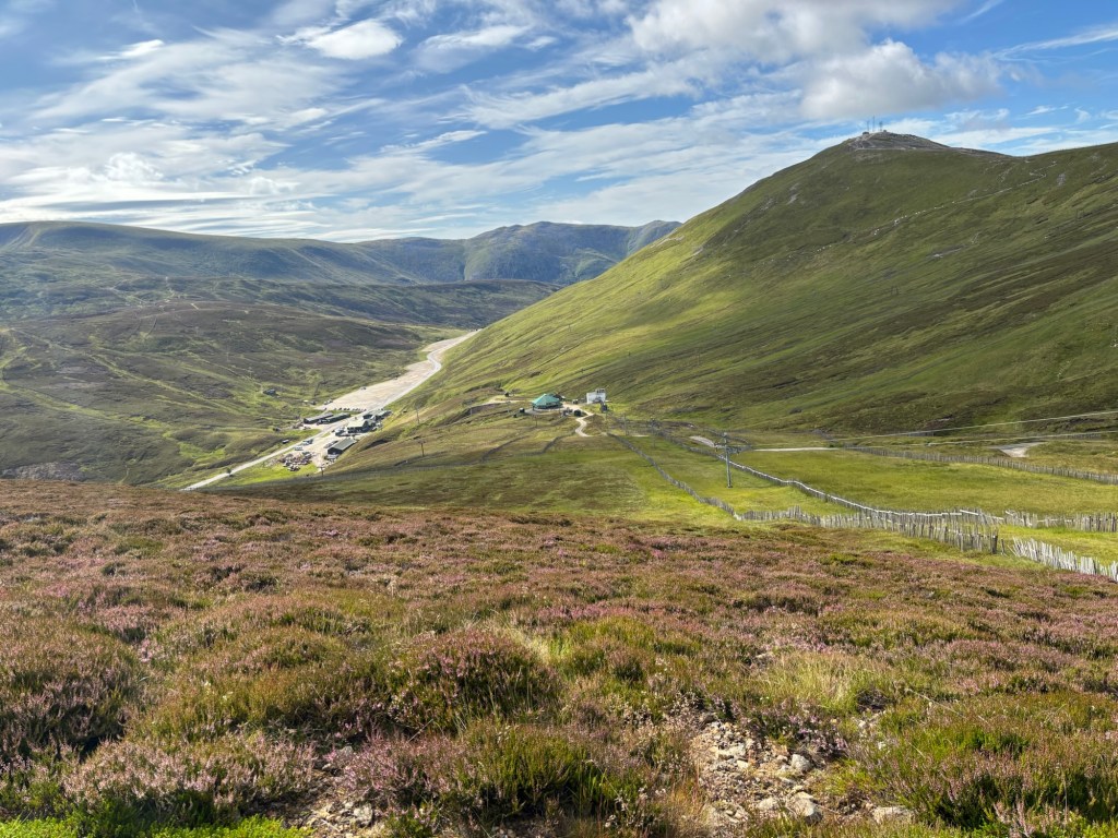 Many hiking guides lament the state of The Cairnwell and Càrn Aosda—the two mountains operated by the ski resort. After the spectacular drive through the barren glens, I understand why many people perceive this development as a scar. If I were only looking for beautiful views from the summit, I would think so too. But heather clings to much of the mountainside and, in the distance, the peaks rise: a green ocean with plumes of mist. Beauty persists.