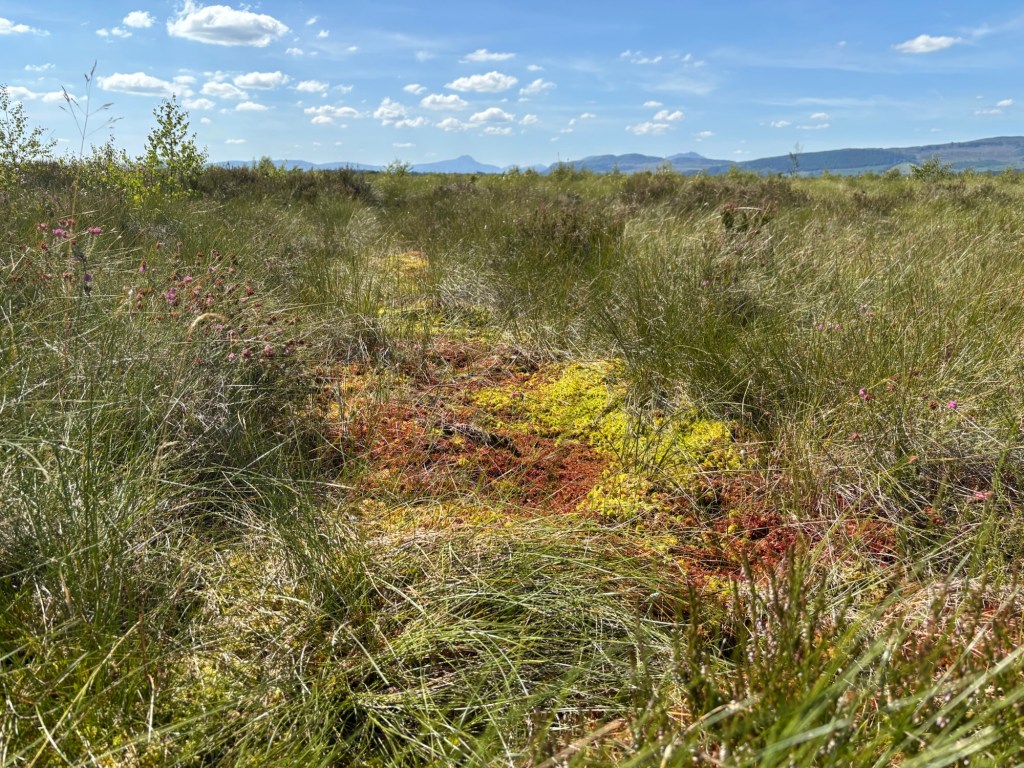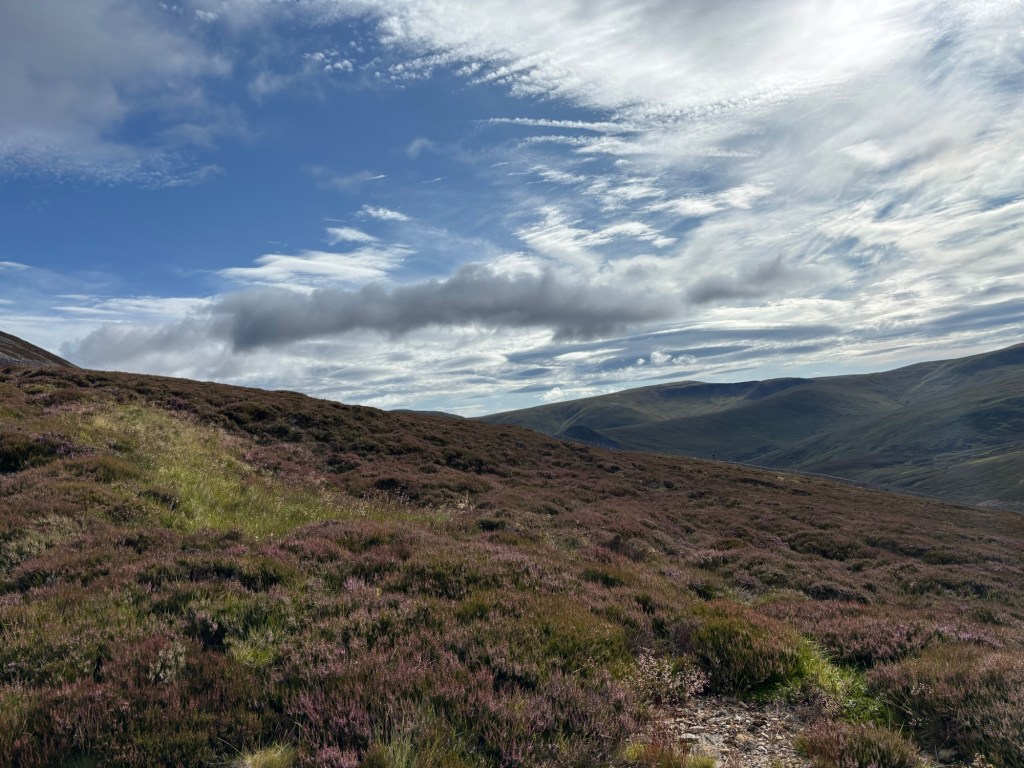 Beaucoup de guides de randonnée lamentent l’état de The Cairnwell et de Càrn Aosda – les deux montagnes exploitées par le centre de ski. Après la route spectaculaire dans les vallons nus, je comprends que plusieurs personnes perçoivent ce développement comme une cicatrice. Si je ne cherchais que les belles vues du sommet, je penserais ainsi aussi. Mais la bruyère s’agrippe sur une grande partie du flanc des montagne et, au loin, les sommets se soulèvent: un océan vert aux moutons de brume. La beauté s’obstine.