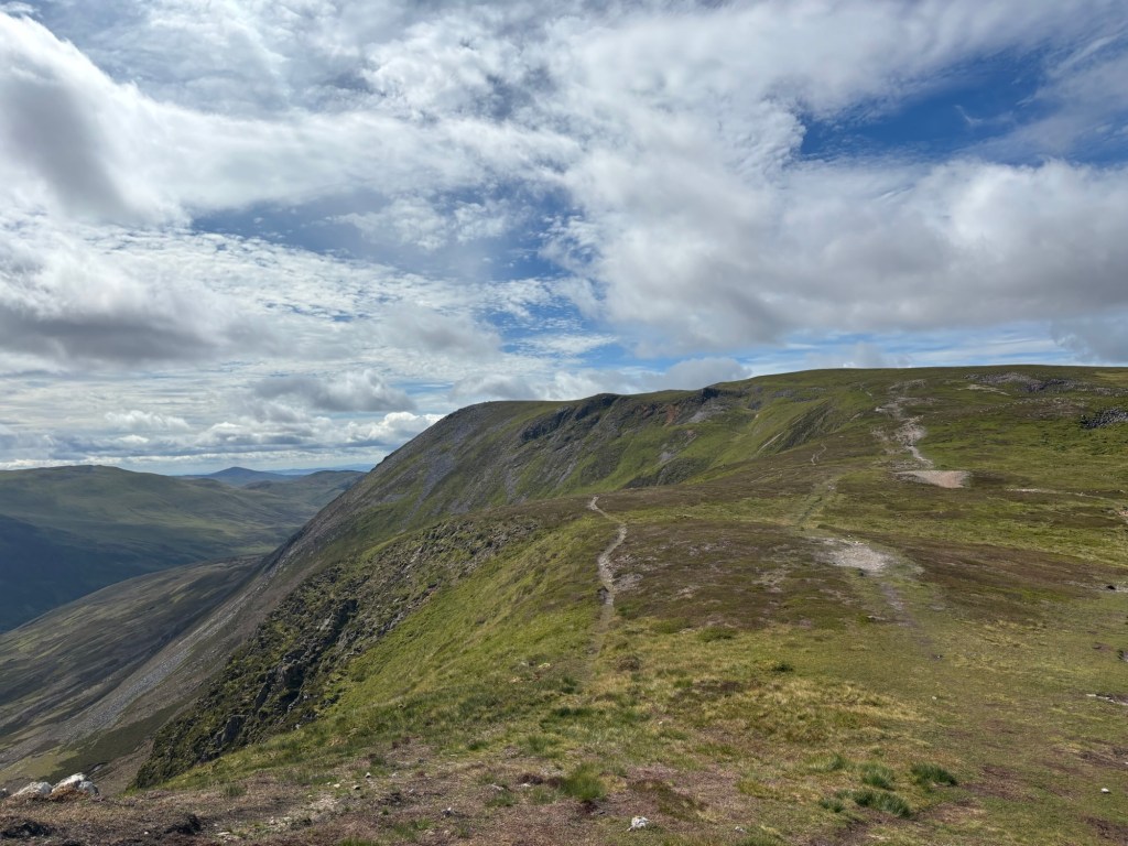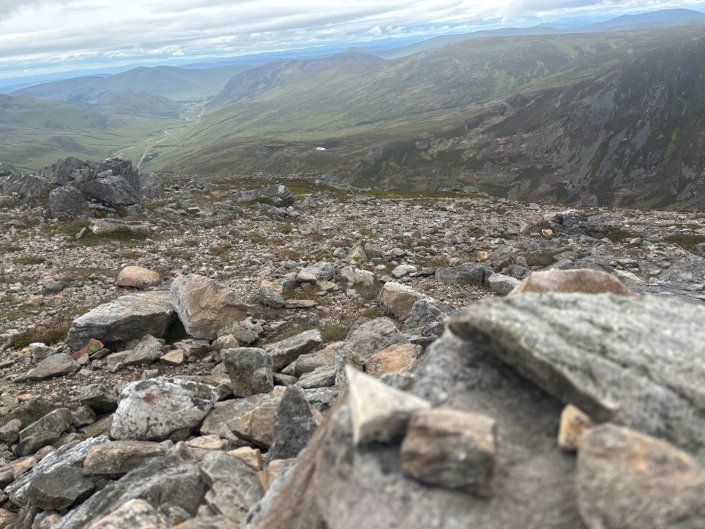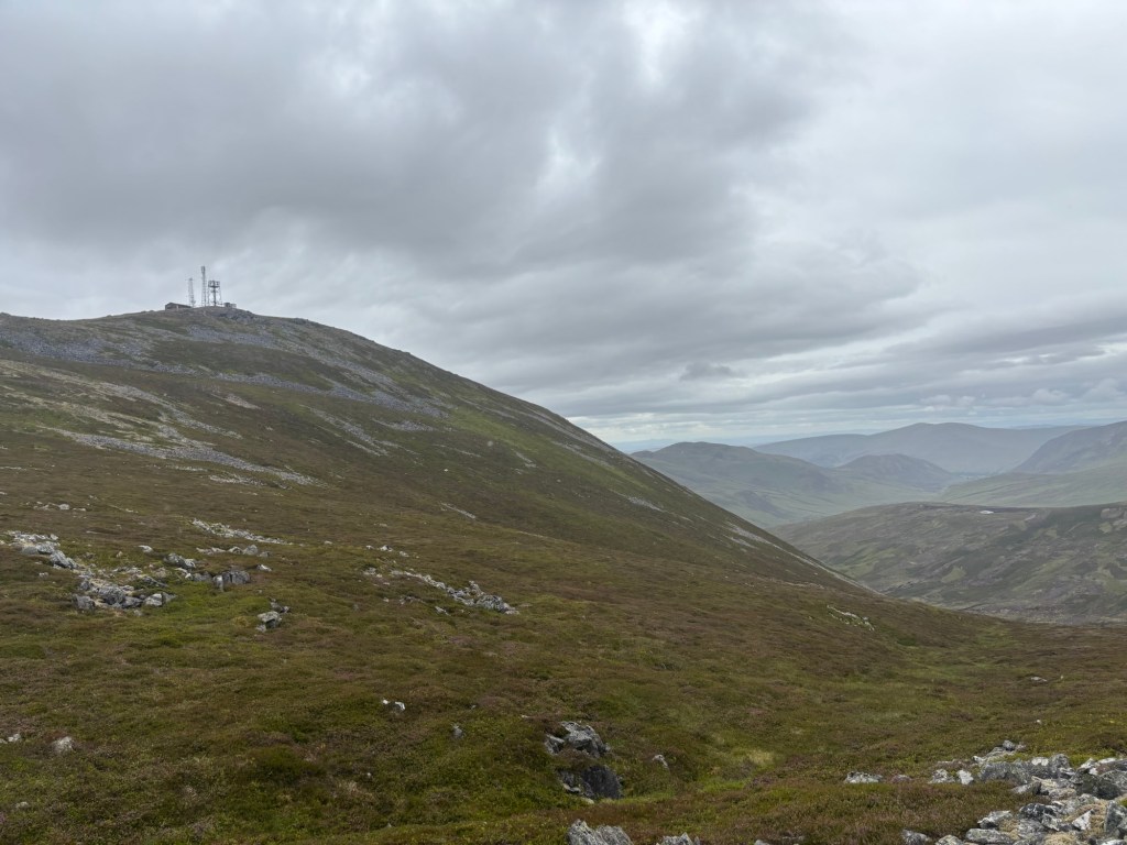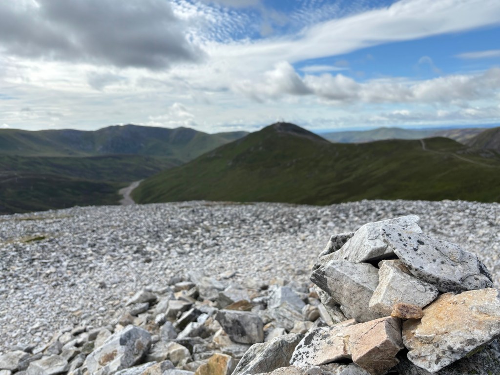 On Thursday, I climbed the Cairnwell Munros, a trio of peaks that now house a ski resort. Càrn Aosda is the first peak, which you climb via a nearly straight scree path. I was there in less than an hour (the car park is at about 600 metres, and the summit is only 917 metres high).
