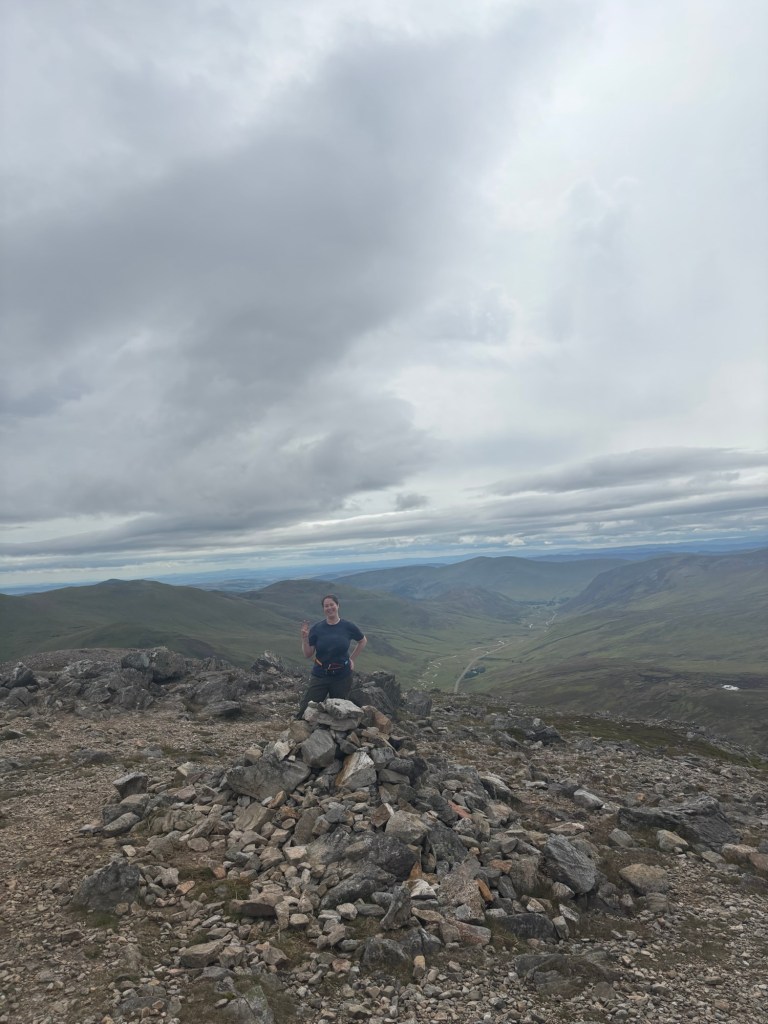 Le troisième sommet, The Cairnwell, est accessible en longeant la crête des collines avoisinantes et est également desservi par un escalateur à skieur. D’ailleurs, quelques marcheurs nous ont rejoint ainsi. Des pylônes électriques peuplent le sommet, mais les vues n’en sont pas moins spectaculaires. Bref, ça a été une journée de rires, de chasses aux cailloux et d’histoires partagées.