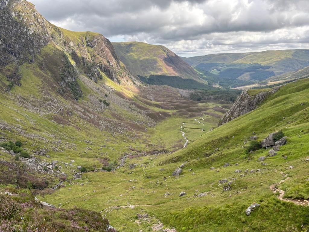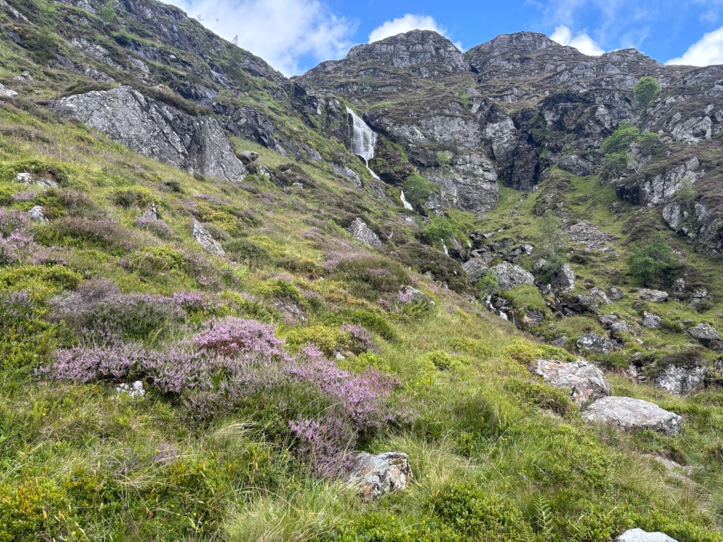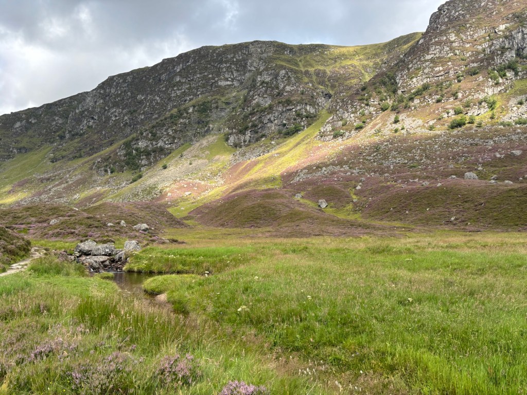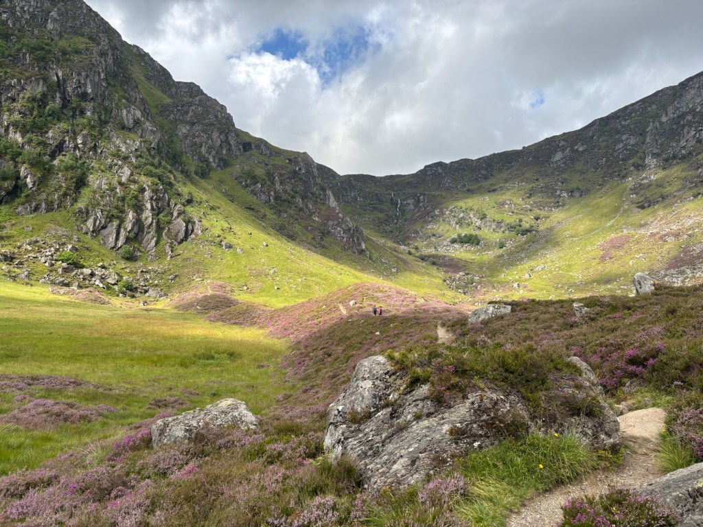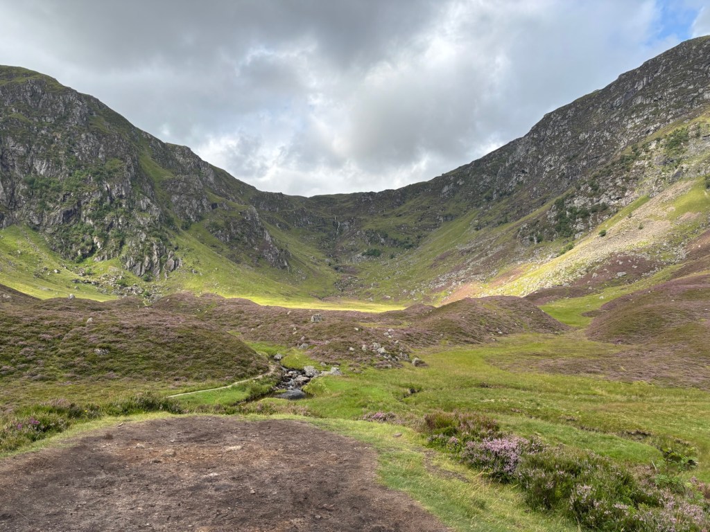 From the Glen Doll parking lot and visitor center (where there are restrooms, yay!), I walked along Jock’s Road. You first pass through a conifer plantation, then emerge into a breathtaking valley: Corrie Fee. This place rivals Puck’s Glen—the most magical place I’ve ever walked in. The surrounding mountains are covered in heather, and the valley is a village of small flowering hillocks. The purple of the flowers, the khaki of the grass, and the luminous gray of the rocks create a real visual symphony.