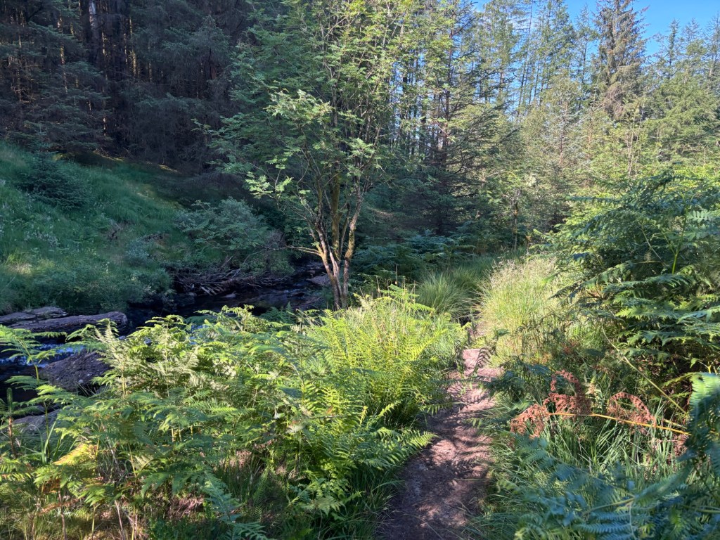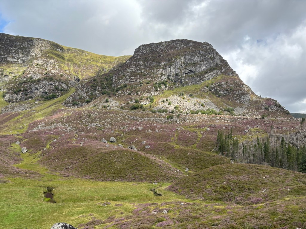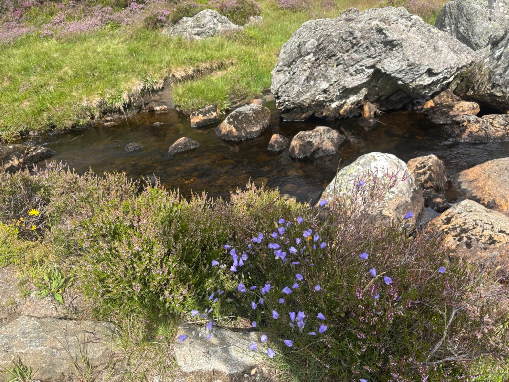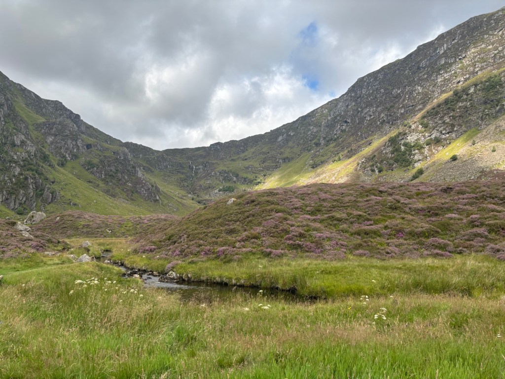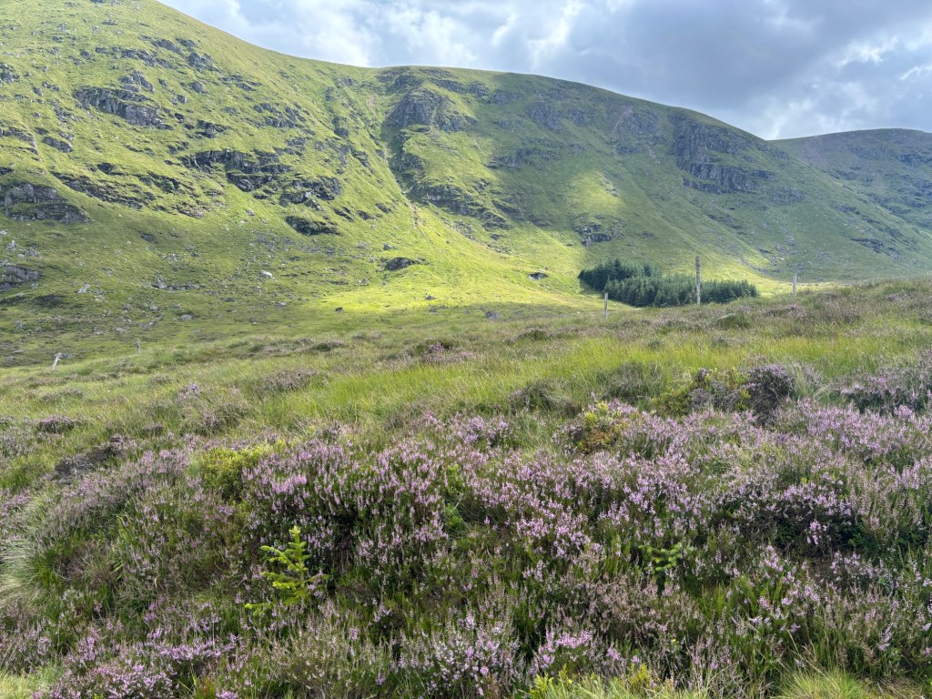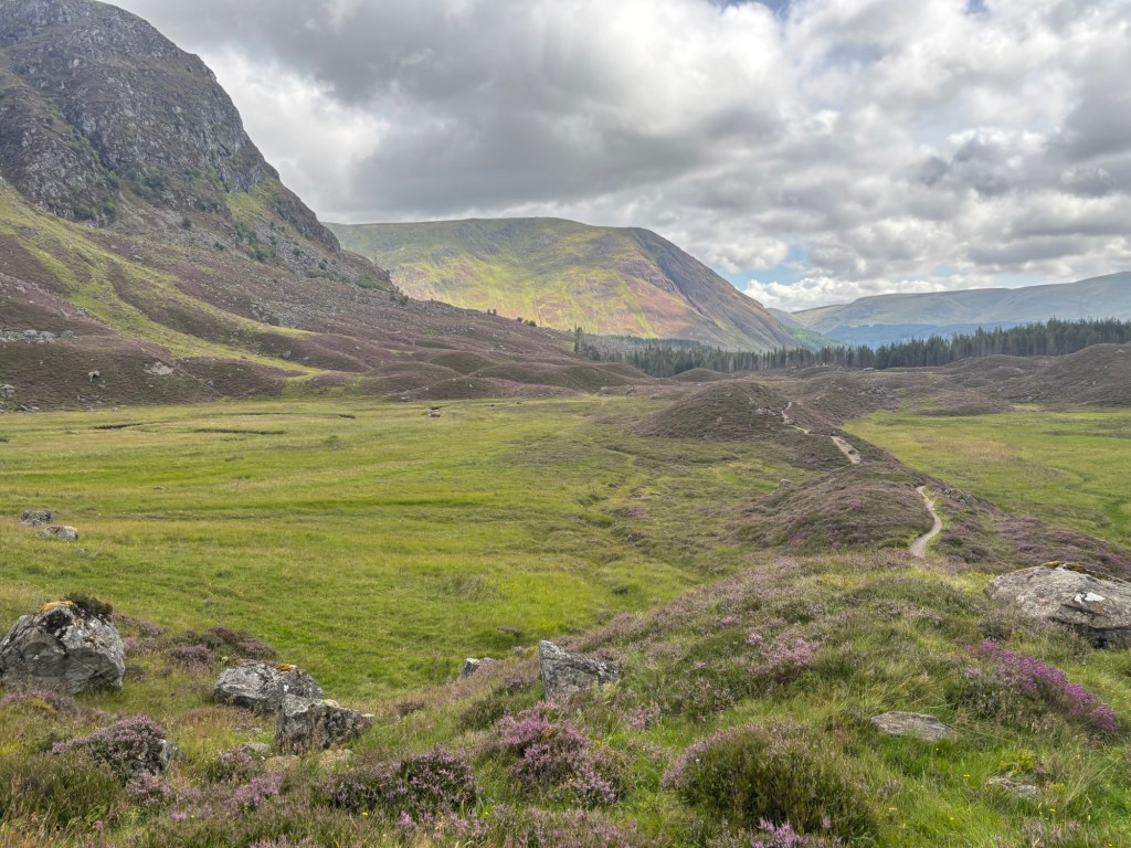 From the Glen Doll parking lot and visitor center (where there are restrooms, yay!), I walked along Jock’s Road. You first pass through a conifer plantation, then emerge into a breathtaking valley: Corrie Fee. This place rivals Puck’s Glen—the most magical place I’ve ever walked in. The surrounding mountains are covered in heather, and the valley is a village of small flowering hillocks. The purple of the flowers, the khaki of the grass, and the luminous gray of the rocks create a real visual symphony.