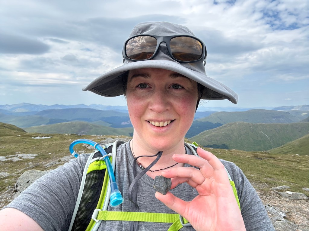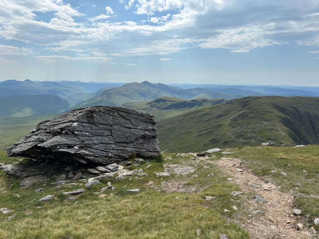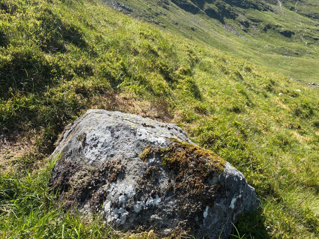 En descendant Ben Lui, j’hésitais à gravir le 2e sommet (Beinn a’Chlèibh), parce que mon genou droit me fait souffrir depuis une bonne semaine. Mais quand j’ai reçu un message de ma soeur me disant que ma nièce aimerait être sur la montagne avec moi, je n’ai pas pu abandonner. J’ai ramassé une petite pierre, un morceau de quartz et j’ai gravé son petit nom pour lui dédier le 2e sommet de la journée. Au final, ça a été mon moment préféré de la marche, cette ascension de Beinn a’Chlèibh.