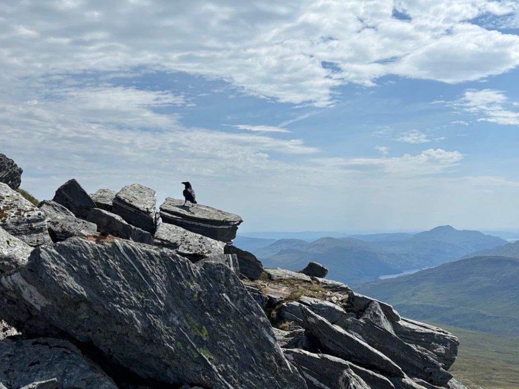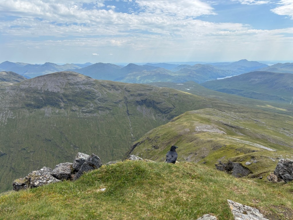 Au sommet de Ben Lui, un corbeau attendait les marcheurs. Il/elle est resté-e près de nous à attendre ses offrandes-collations. Je n’avais rien à lui offrir, malheureusement, mais ce corbeau a tout de même accepté de « photobomber » tous mes clichés du sommet.
