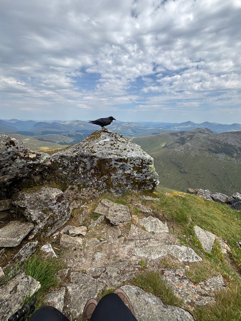 At the summit of Ben Lui, a raven was waiting for the hikers. She/he stayed close to us, waiting for her/his snack offerings. I had nothing to offer, unfortunately, but the raven still agreed to photobomb all my summit shots.