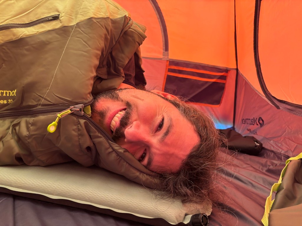 Le camping représente un défi pour moi depuis que j’ai tenté de traverser l’Irlande du Sud au Nord – un trajet de 1000 kilomètres entamé en 2018. C’était ma première expérience de camping sauvage : trouver un terrain assez plat (bof), assez exempt de merde de moutons (impossible), assez éloigné d’autrui (une seule maison en vue et très loin), et y planter ma petite tente de façon à rester au sec et de pas partir au vent (ish). Je me souviens de l’odeur dans la tente comme si c’était hier, et mon estomac se noue encore à l’idée : ça sentait le lichen mouillé, la boue et l’humidité froide et un peu acide. Ce combo olfactif compose l’odeur de l’anxiété pour moi. Je n’avais pas peur des moutons, du lièvre croisé plus tôt, de la pluie ou du vent, mais j’étais terrorisée à l’idée que les occupants de la maison décident de retontir au portique de ma tente. Quand j’ai lu 234 jours, l’excellent récit (histoire vraie) de Guillaume Moreau et de Nicolas Roulx, je me souviens de m’être dit « je reconnais ce sentiment » lorsqu’ils faisaient allusion à la terreur d’être réveillés par des ours polaires. Le pire prédateur pour l’humain est l’humain, après tout. Choisir de faire du camping avec mon conjoint n’était donc pas aléatoire. Il a une vaste expérience de la pratique et son adaptabilité est infatigable. J’ai confiance en lui et sa présence m’a donné le courage d’essayer à nouveau.