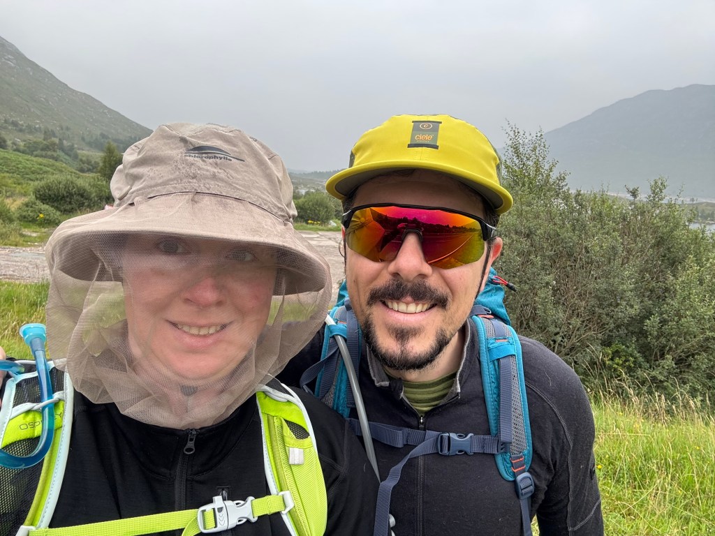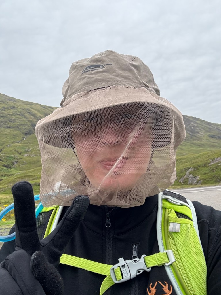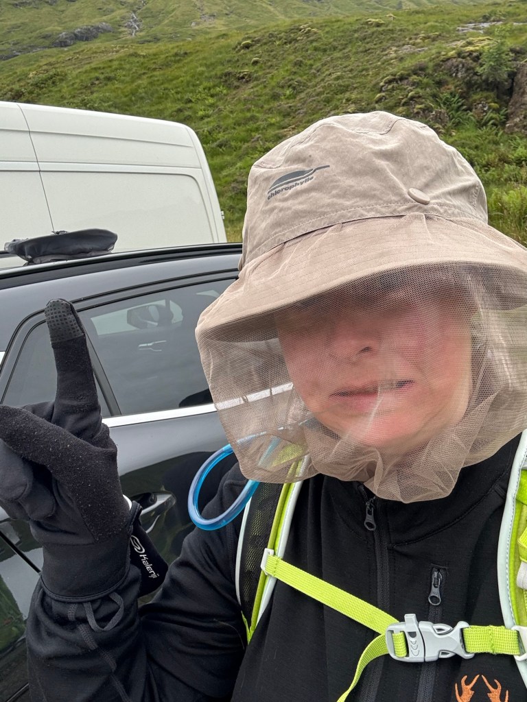 The rest of the hike — the summit of Sàil Chaorainn and the descent — was filled with laughter and joy. Phil got his first taste of a true steep, almost pathless, ultra-muddy descent. It was brutal on my right knee, which has been acting up ever since. But the real hell awaited us at the bottom: midgies. Oh my gosh. I swear, the seven circles of hell are inhabited by these infernal creatures. Tiny biting flies — about the size of fruit flies or smaller — that get everywhere. I didn’t think it was possible, but I was practically sprinting along the road back to the car, leaping over deep roadside ditches. It was apocalyptic.