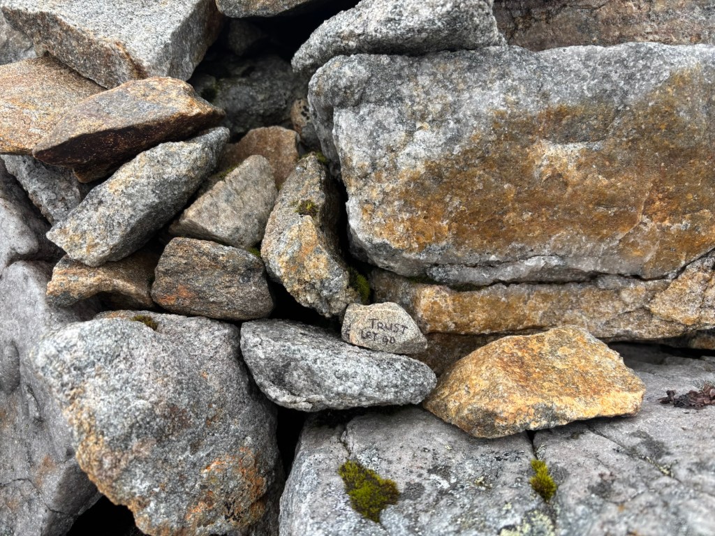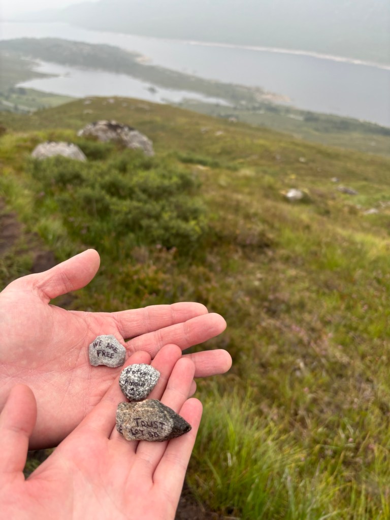 At the second summit, we talked for a long time. I think that’s the greatest gift we give each other — open, honest conversations. I explained the story I was telling myself — the one making me want to quit or, worse, to trade the mountains for another long-distance trail. I say “worse” because it would mean choosing familiarity, guaranteed success, over the unknown and the possibility of failure. What a weight I left up there, on Sgùrr nan Conbhairean! We placed our second stone with intentions we’d chosen together during that gorgeous climb through the heather — without knowing how badly I’d need them.