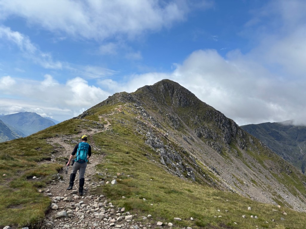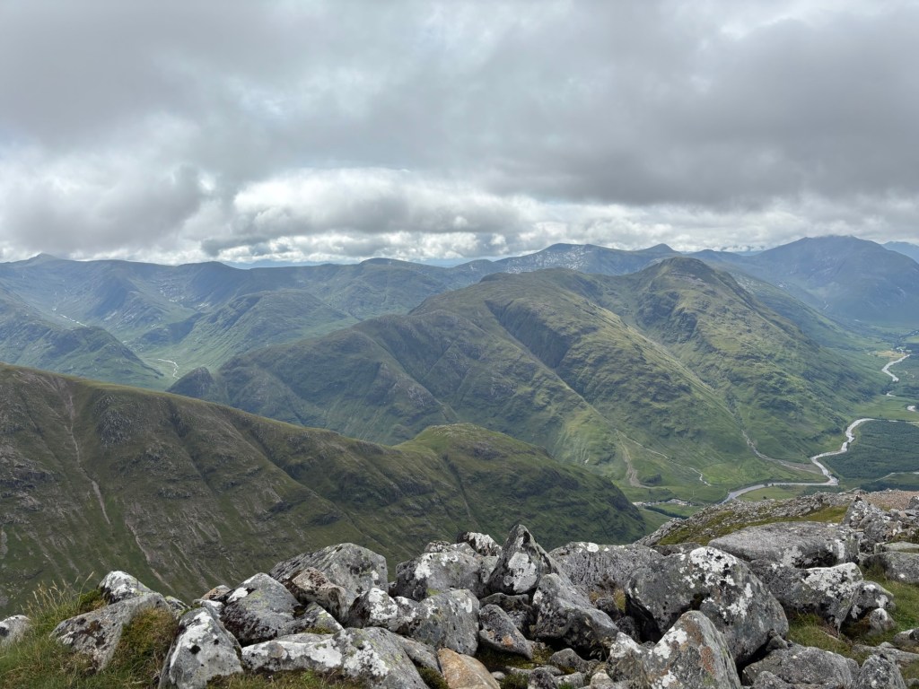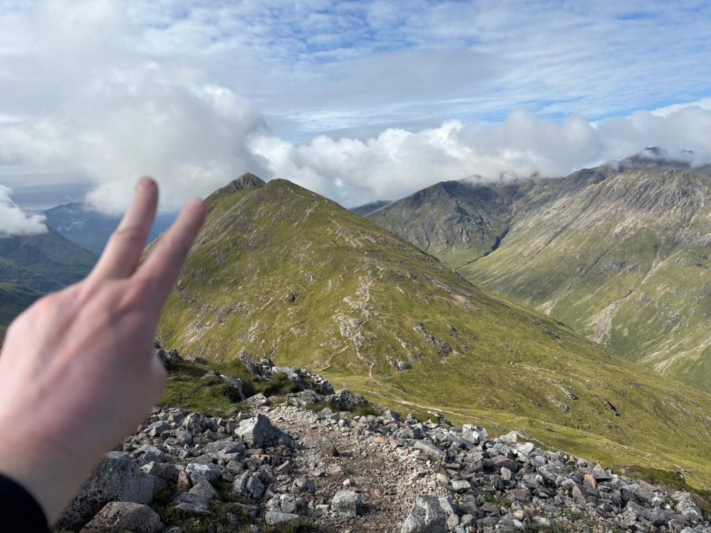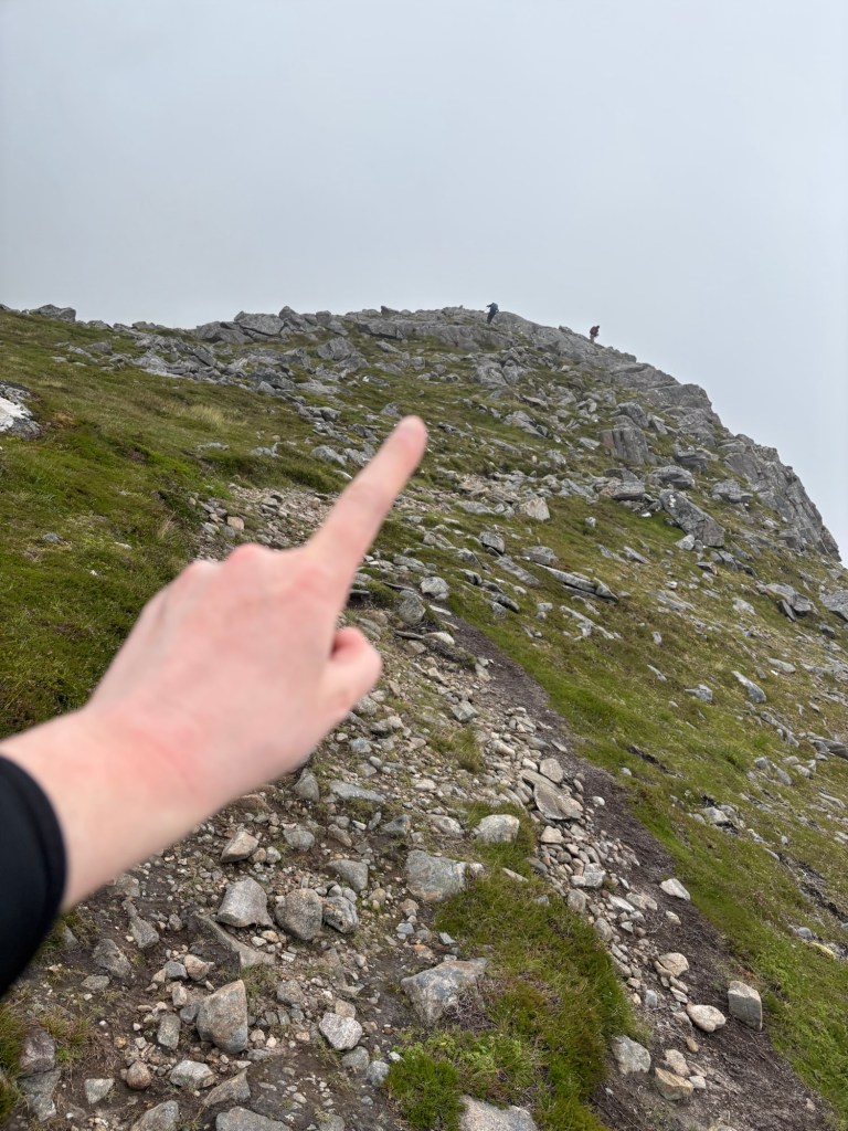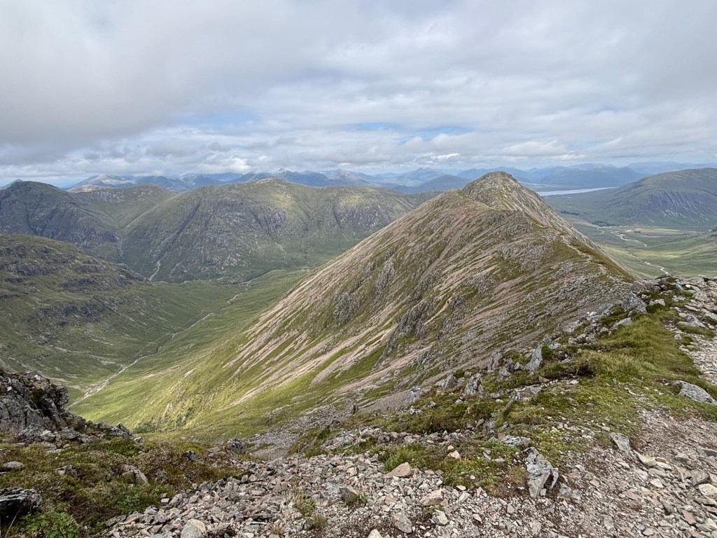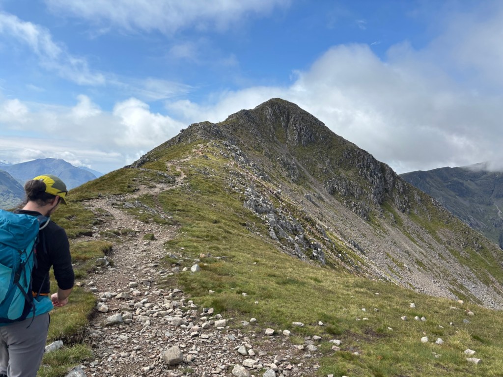 Our second mountain hike was Buachaille Etive Beag — two summits in Glencoe Valley. We stayed at the Bunkhouse after the frostiest welcome I’ve ever seen. The Bunkhouse is the youth hostel attached to the Kingshouse Hotel — a very posh place and the only hotel in Glencoe Valley. Having worked at Château Frontenac, I can say any staff treating guests like we were treated would’ve been fired. Both at the front desk and the Way Inn, it felt like we were a nuisance. I thought it would be a highlight, but it turned out to be the lowlight. Anyway, we slept in bunk beds and got up early to ensure a parking spot at the base. Driving the A82 the day before, the tourists were worse than the midgies — and far more dangerous behind the wheel. Tourist-heavy areas were the worst part of our trip. We started the hike at 8:30 a.m., already surrounded by… midgies! The first 2/3 of the climb was a bug nightmare. It was my earliest start so far; midgies are most active in the morning dew and evening mist. The bugs pushed me to my fastest climb yet — but not my most pleasant. Once at the saddle between the summits, we chose to climb Stob Coire Raineach before the taller Stob Dubh.