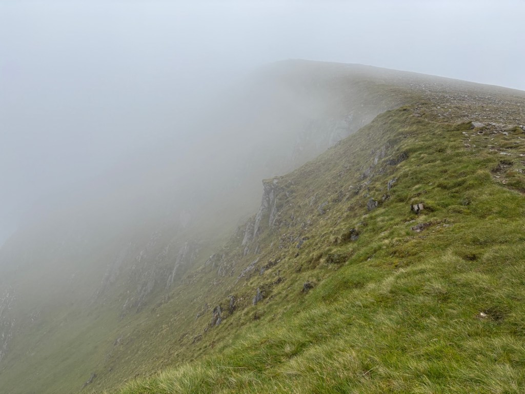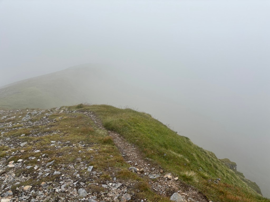 The climb was steep and rocky, but at least the midgies had calmed down. Stob Dubh was gentler and much more enjoyable. Higher up, there was a ridge trail — my favorite hiking moment. As Walkhighlands suggests, we went past the summit for an absolutely stunning view.