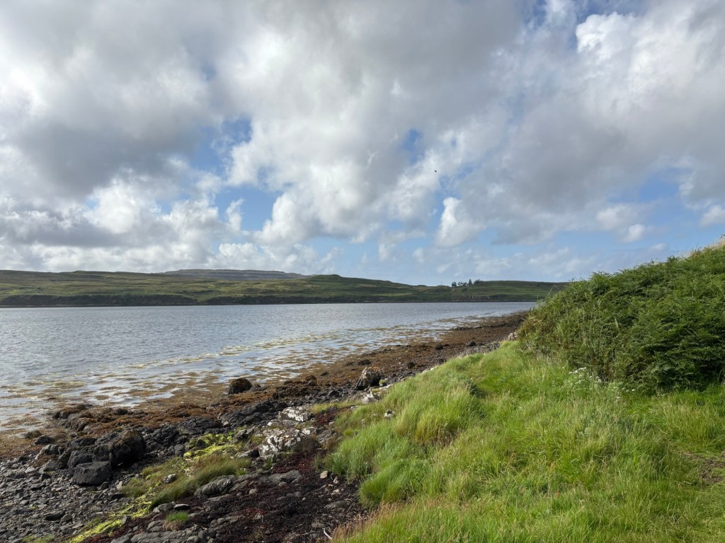 Notre deuxième terrain de camping était situé au nord de l’île de Skye, sur la A850 en direction de Dunvegan Castle. Le terrain était un peu pentu, et à 3 reprises Phil s’est réveillé à mi-chemin dans la tente, son sac de couchage ayant glissé contre son tapis de sol. Pauvre amour dans son cocon de couchage vert, il était recroquevillé comme un ténébrion dans la farine. Comme je ne pensais pas être en mesure d’avoir un sommeil réparateur s’il fallait m’adapter à un sac de couchage contraignant en plus de tout le reste, j’avais apporté mon couvre-matelas style coquille d’œuf (nécessaire pour dormir sur les matelas du campus si on pèse plus de 80 livres), mon drap contour, mon duvet double (parce que mes pieds dépassent de celui fourni à l’uni) et mon oreiller. Ce setup laborieux était tout de même le plus rapide à ramasser, puisque je roulais tout ensemble comme un roulé suisse et attachait le tout avec deux bungee cords. En plus, mon kit était assez antidérapant pour me permettre de très bien dormir dans une pente.