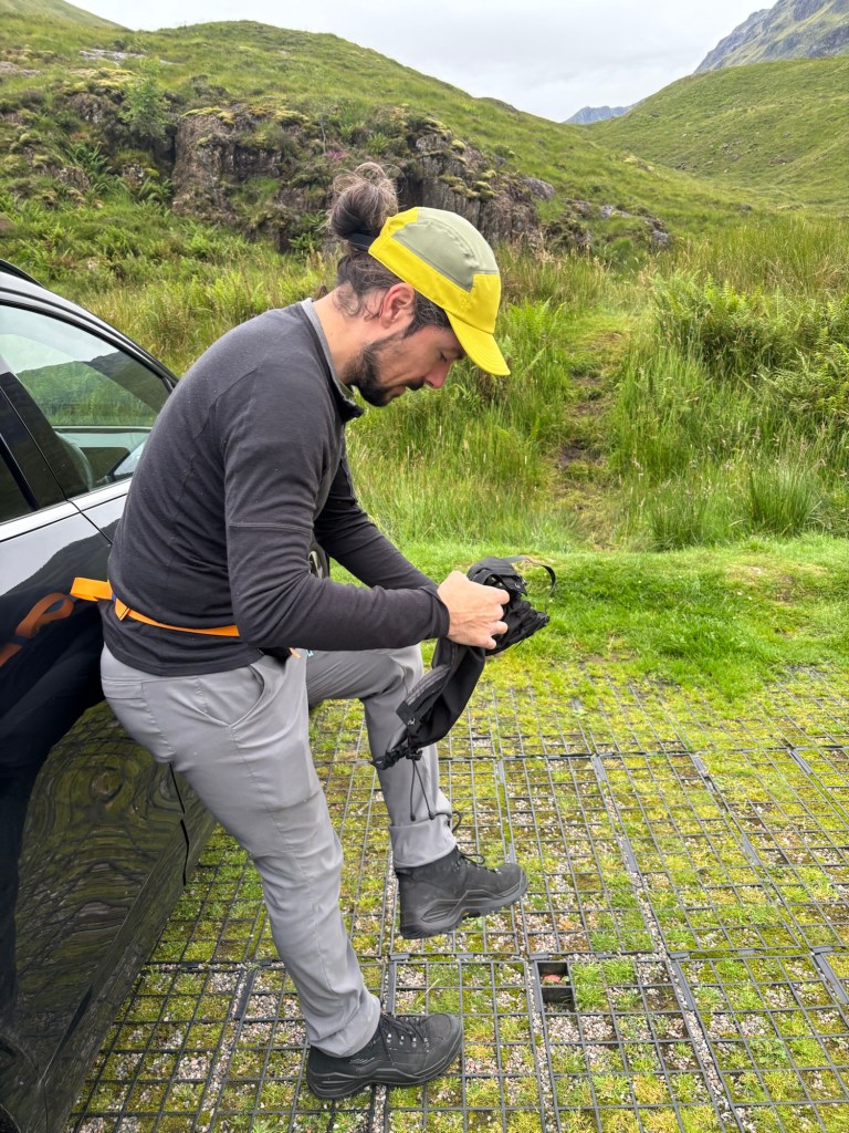 We left for our first campsite on Monday, July 21st, aiming for a charming little spot that would take nearly four hours to reach from Stirling. Just an hour into the drive, the skies opened up. Rain in Scotland doesn’t fall so much as it dumps from the heavens. There are “waterproof” materials, and then there are materials that are “Scottish waterproof” — a very different category altogether. Forget umbrellas, forget cute raincoats, forget stylish hats or water-repellent trousers. Unless your gear is purpose-built for the Highlands, it’s going to soak through. That’s why I came prepared, armed with re-waterproofing sprays and a weekly boot-cleaning ritual.