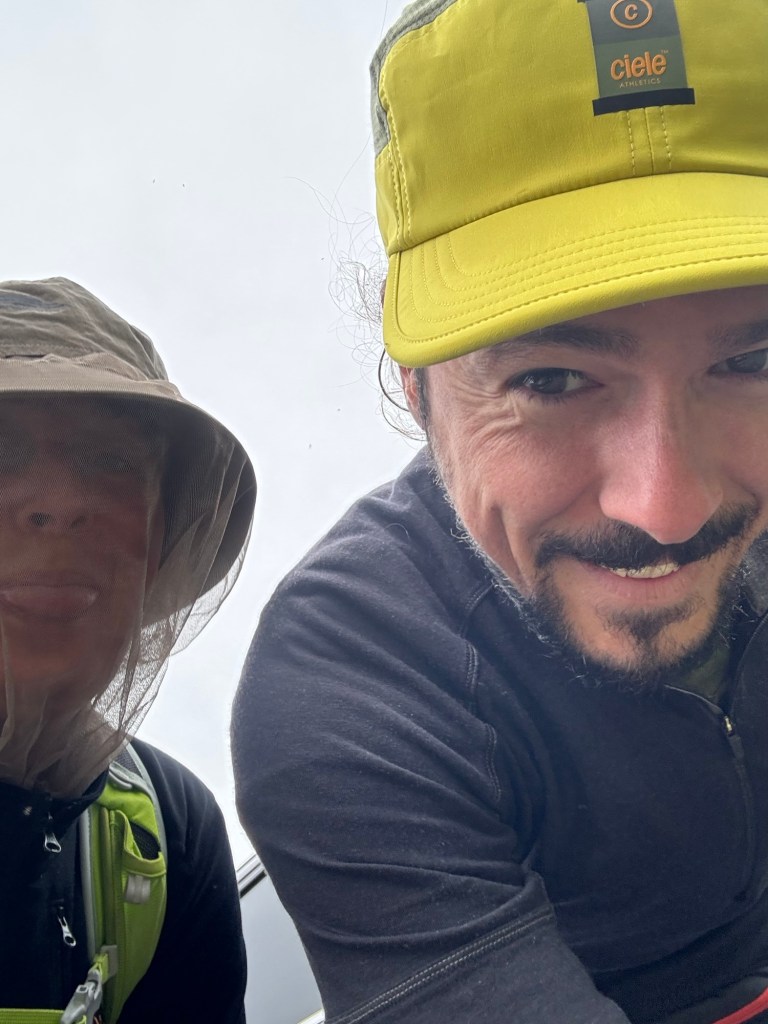 Phil helped me pull out my mesh net hat from my bag, but didn’t want to wear his right away. I shoved mine over my head, tuque and all — no time to waste — and marched off like a furious locomotive. A bit later, I turned to make sure he was following, but… no sign of him. I kept fidgeting because the midgies were getting inside my net. Ahhh no, come on, where is he, should I turn back? It was so unbearable that — to my great shame — I abandoned him to his fate and power-walked away. From that point on, I scanned for places to pull over and pick him up: I vowed to rescue him from that terrible midgies-infested road. He told me earlier that he had slightly twisted his ankle and knee in the mud — maybe that was why he was slower. I was screaming inside, my face under siege. I choked on midgies, nearly threw up, and from that point I only breathed through my nose — the bugs would end up in a tissue. At the car, I had a plan: poles behind the seat, shake out the pack, toss it in, shake off the net, throw it on the pile, slam the door, jump in front, AC and blower at full blast to blow the forkers out of my face, and floor it to go pick up my love. He was almost there — I found him just one bend away. OMG, guys.