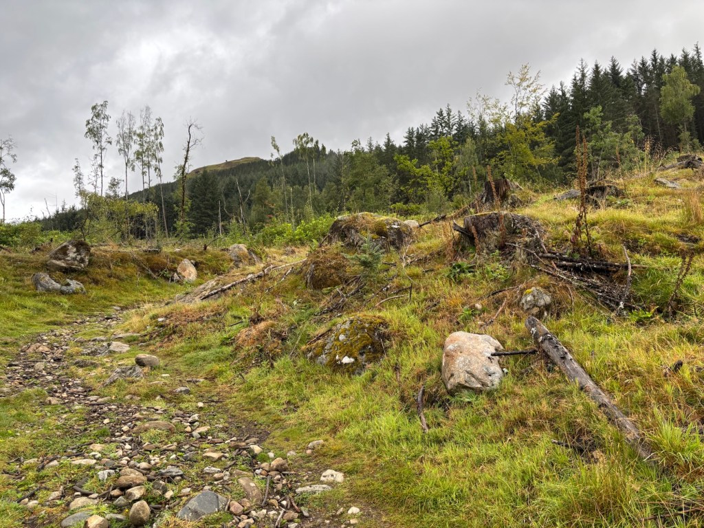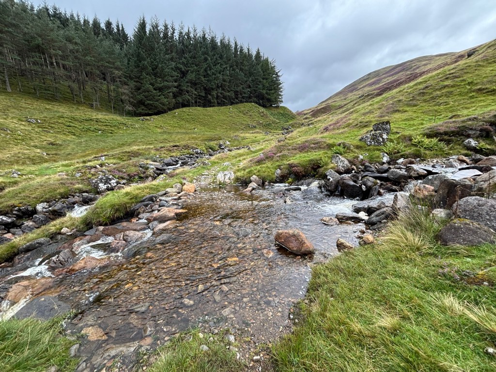 The approach passes through a backyard forest, then climbs a scree path lined with sheep. Further on, the path continues past a river I struggled to cross — only to realize later that my bridge had been a little off to the left. I crossed the river again on the same wobbly rocks, then joined the trail leading to the summit of Càrn Gorm.