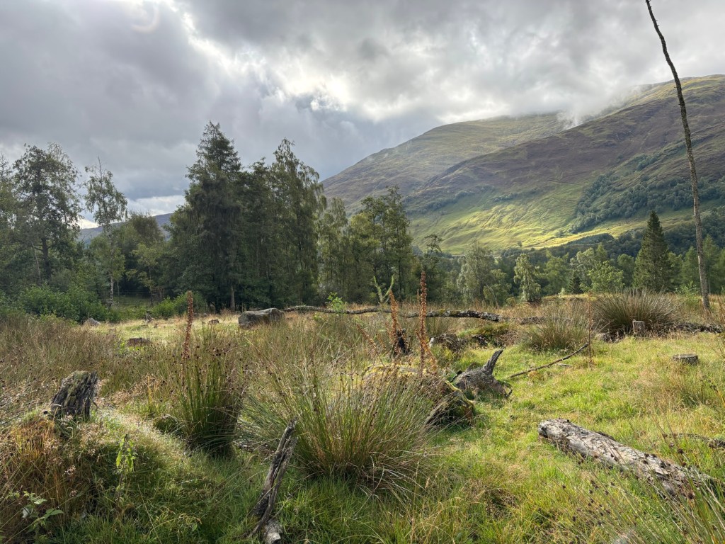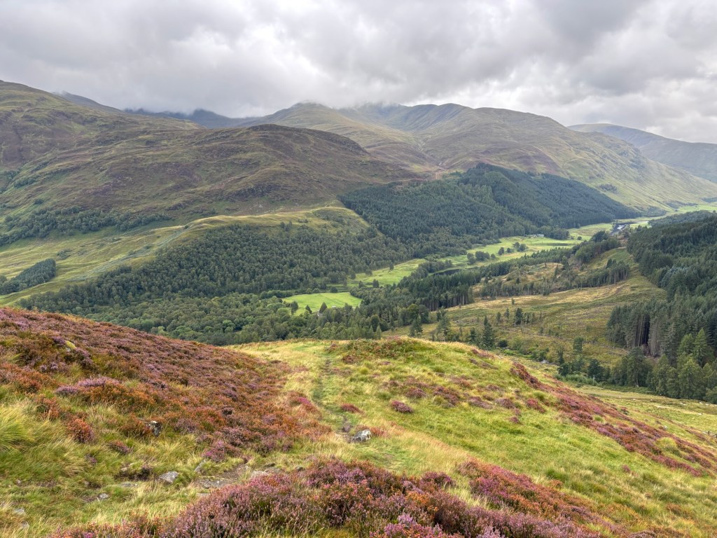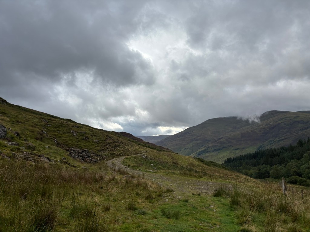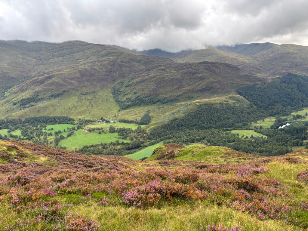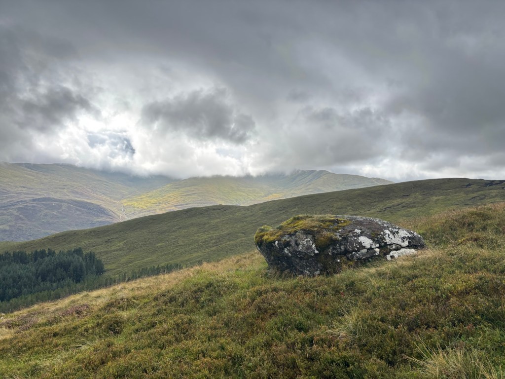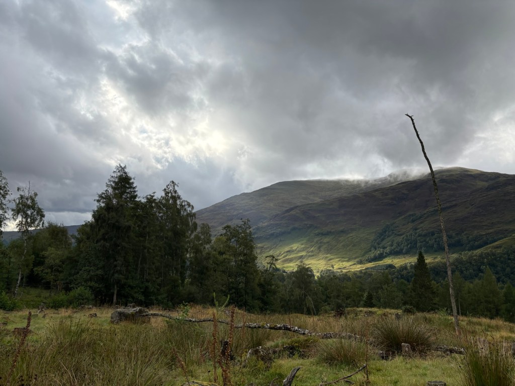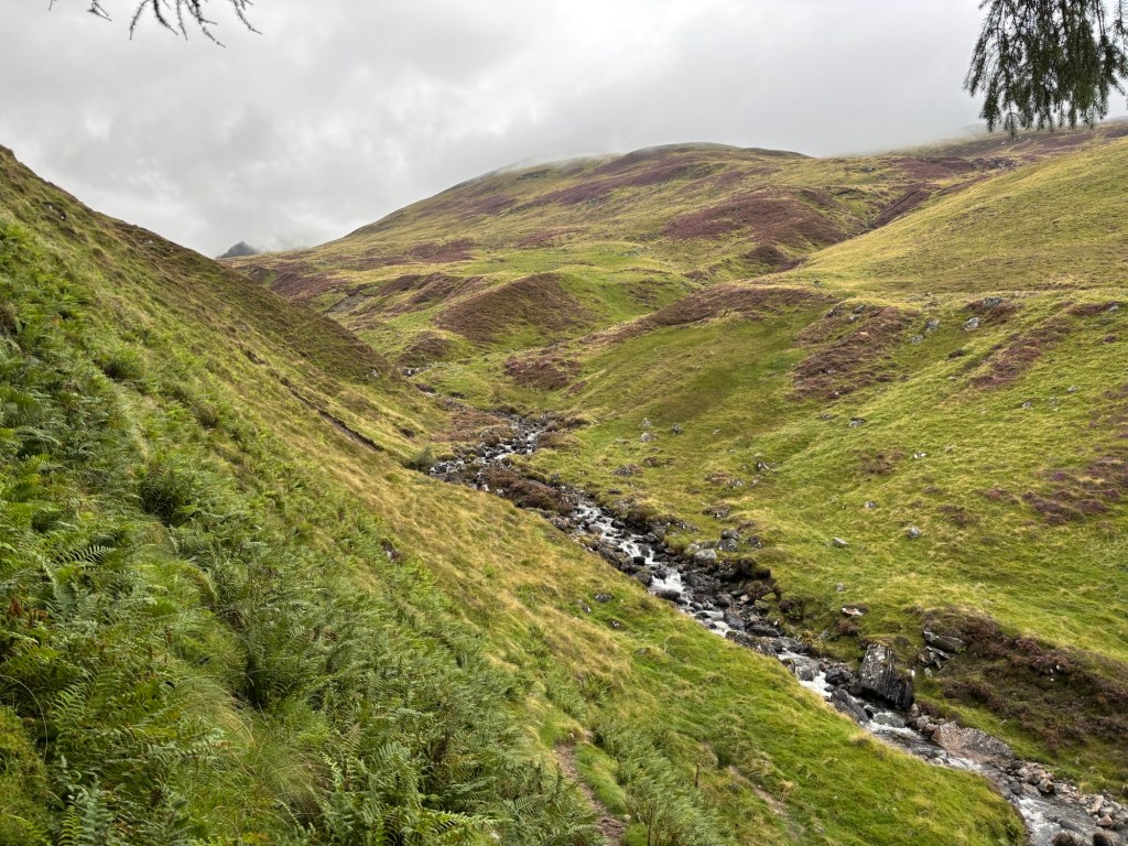 J’ai décidé tôt dans notre voyage à trois que je ne ferais qu’une autre sortie en montagne : les quatre sommets de Glen Lyon. Il s’agit d’une sortie d’environ 19 kilomètres avec 1330 mètres d’ascension (ou un peu plus, puisque j’ai aussi gravi les « tops » le long de l’arête). Une marche de 9h30 le vendredi 29 août, lors d’une journée grise, puis brumeuse, puis diluvienne.