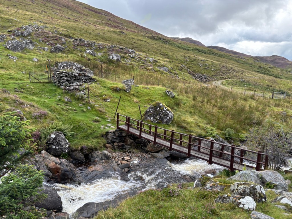 L’approche traverse un boisé de cour arrière, puis grimpe sur un chemin de scree bordé de moutons. Plus loin, le chemin continue derrière une rivière que j’ai peiné à traverser, avant de réaliser que mon pont se trouvait en retrait, sur ma gauche. J’ai retraversé la rivière sur les mêmes têtes de rochers précaires, puis me suis engagée sur le sentier qui sillonnait jusqu’au sommet de Càrn Gorm.