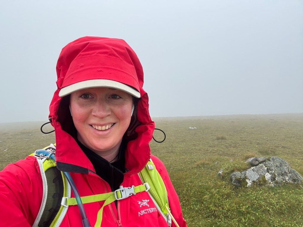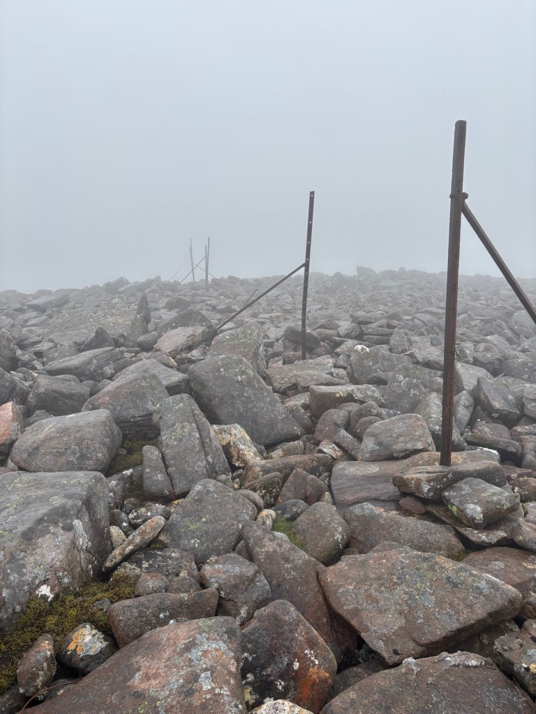 From that point on, visibility dropped. Without my GPS, I had to rely on fence posts that roughly indicated the way. I mentally repeated the notes I’d read the day before, like: “The second summit’s cairn is made of fence posts torn down by the wind, and you can follow the fence line almost all the way to the third summit.” The wind and rain were so intense I could barely lift my head. Thankfully, I had a cap — without it, I wouldn’t have seen a thing. I’d spot a post, walk toward it, then continue roughly in a straight line (by feel) until the next post came into view, recalibrating as I went.