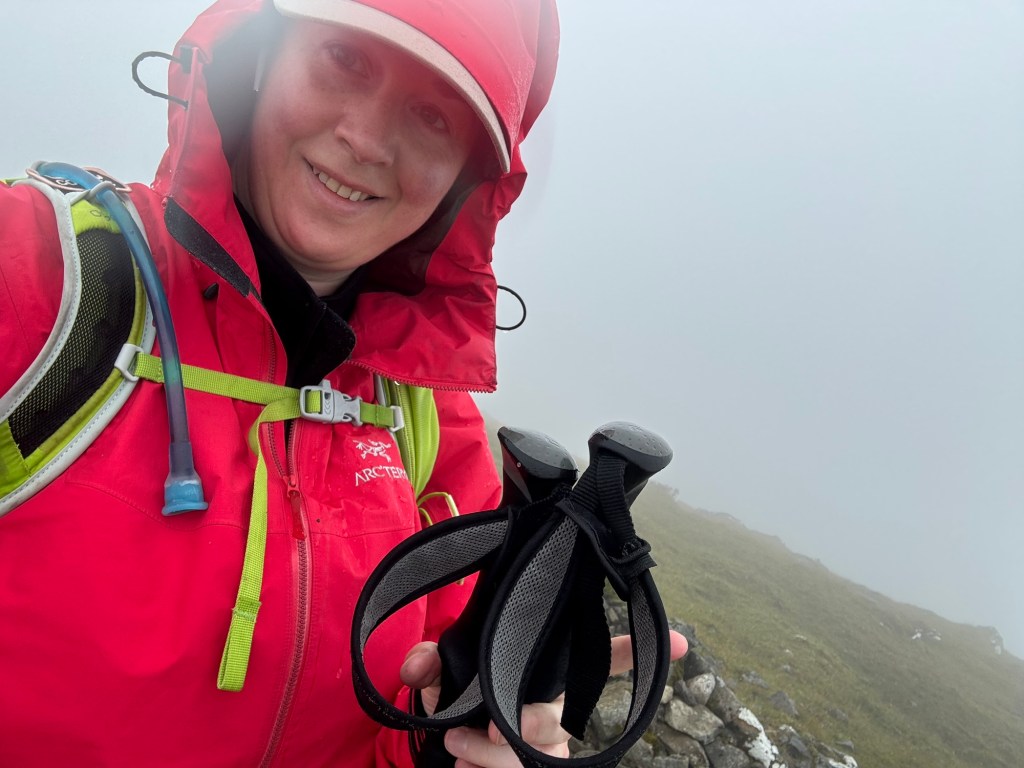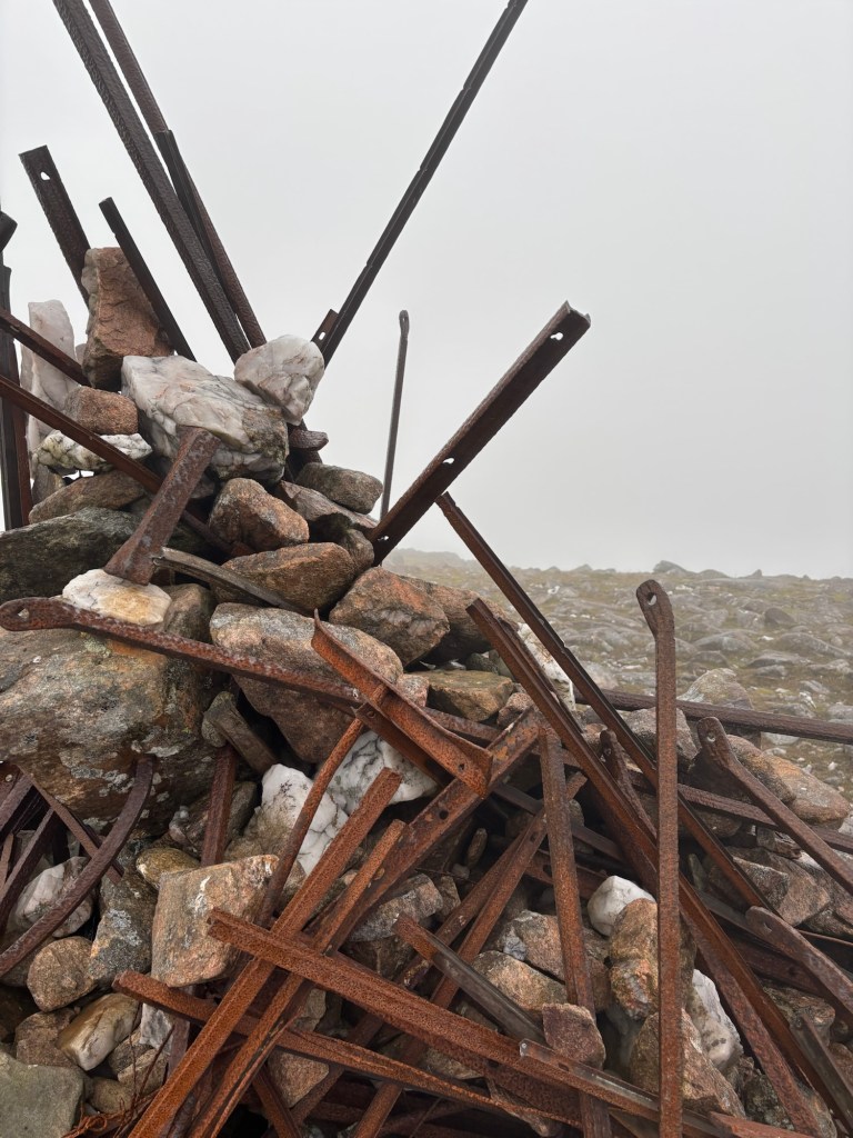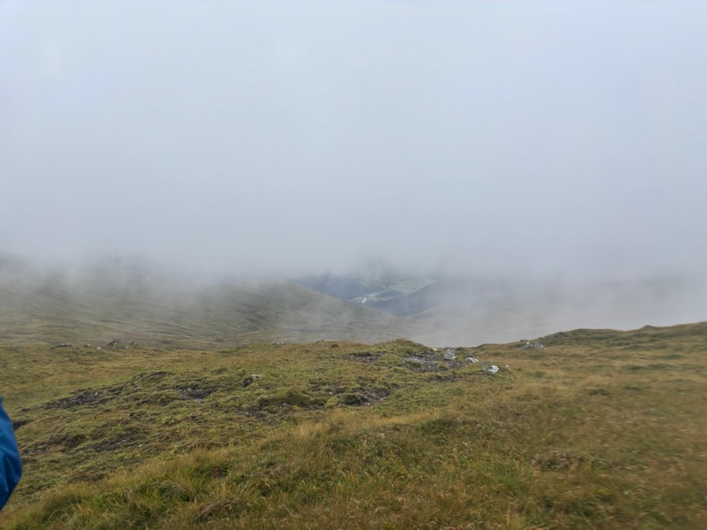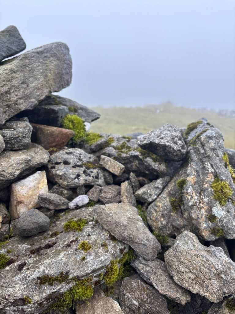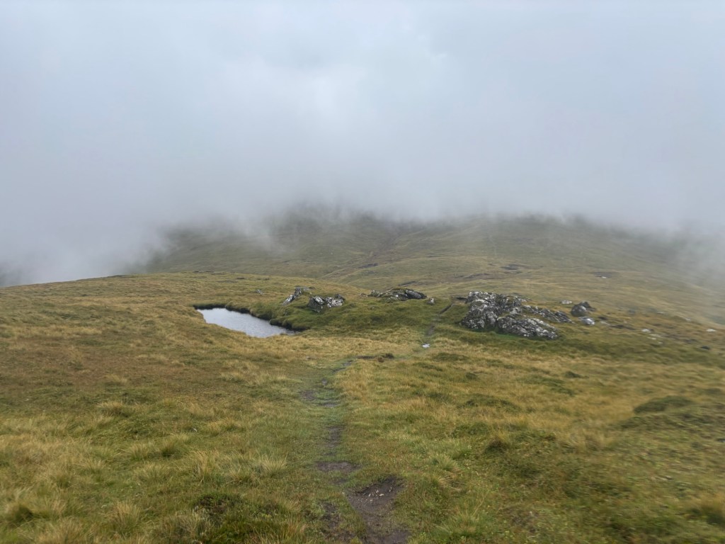 My GPS was glitching — the arrow wasn’t pointing in the right direction — and I had to guess the route multiple times based on where I’d come from. Before hitting full altitude, that wasn’t a huge issue. But once I hit the persistent fog at about 900 meters and onwards, things got trickier on the way to the second summit. The wind picked up and the rain (forecast for the afternoon) started pelting me around 11 a.m., as I began the ascent of Meall Gharb. There’s something oddly peaceful about walking in the rain — as long as you have a good jacket, waterproof trousers, and gaiters to hold it all in place. The only downside is that it’s hard — or impossible — to stop and eat in those conditions. I took a summit photo, sheltering from the wind and rain behind a bizarre cairn.