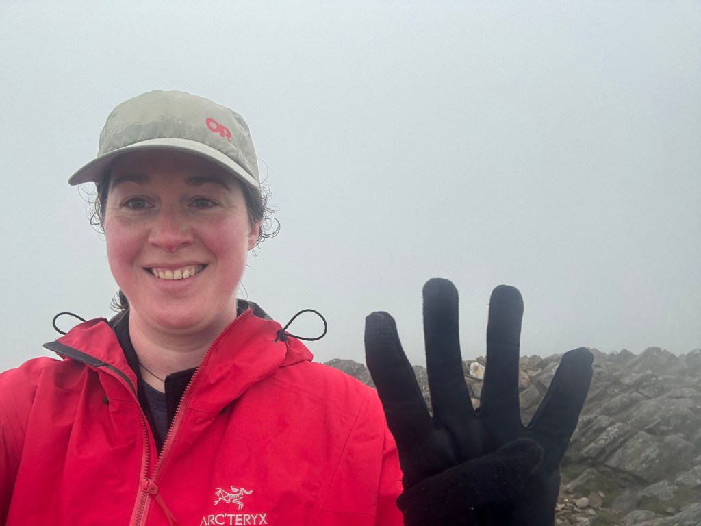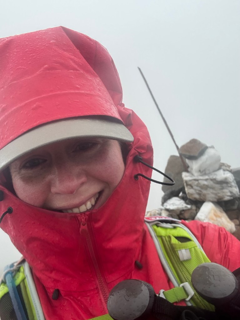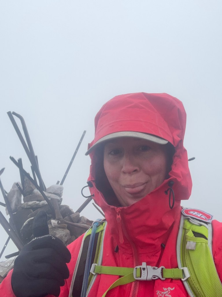 As I took my summit photo, I heard a high-pitched sound behind me through the howling wind. I turned around, and there was someone — right behind me, at the base of the cairn! A hiker from New Zealand had just reached her 100th Munro! She had been wondering whose footprints she was following and found it amazing that we crossed paths right at the summit, especially since the weather wouldn’t have let either of us linger there.