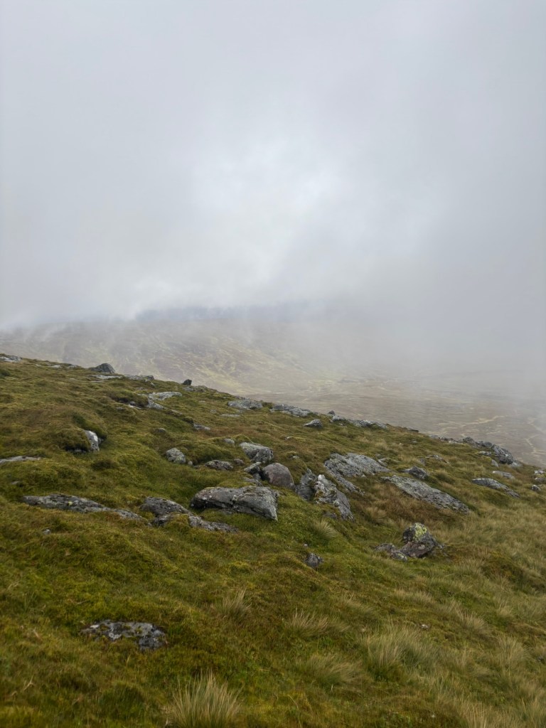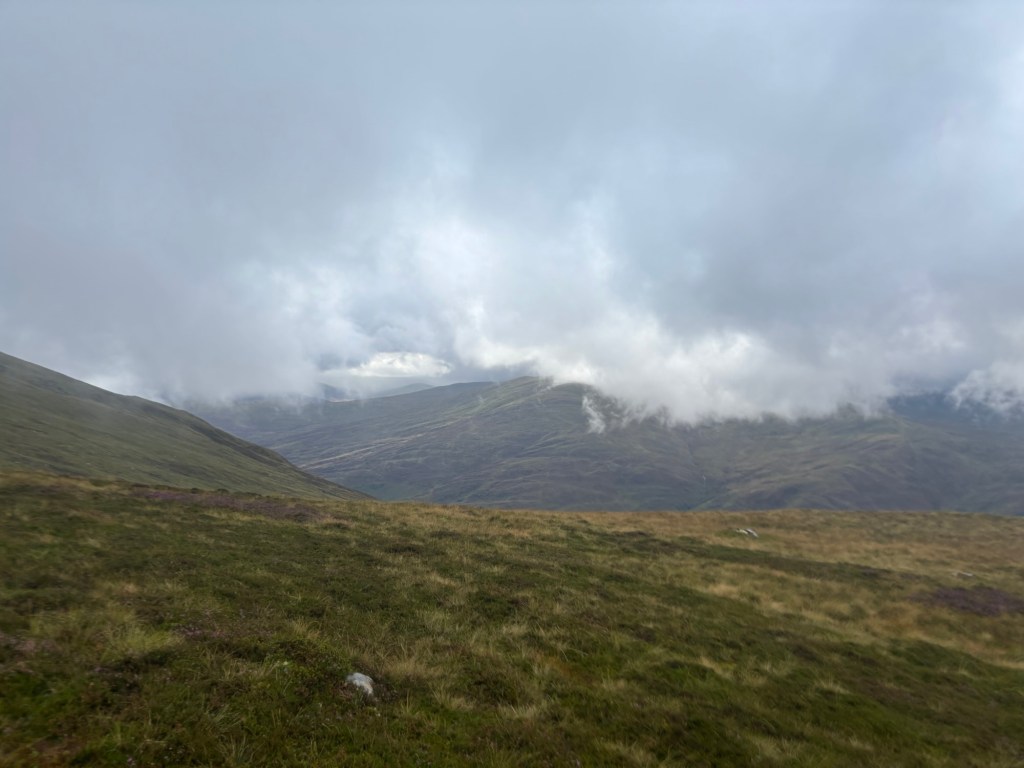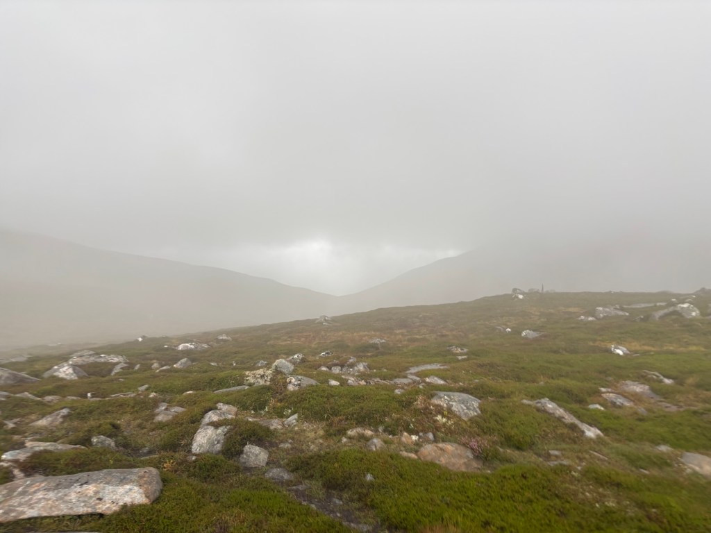 What a balm a human presence is during a storm. Our conversation carried us to the fourth summit, Creag Mhòr, despite a few minor navigation errors. Following her footsteps was far more restful, even if the solo-in-the-fog episode had felt oddly magical and funny. She shared stories of her travels, her Munro project, moments of doubt, and the people who unexpectedly showed up at just the right time. When I confessed I had only climbed 24 summits in 80 days, she sincerely congratulated me — the kind of congratulations that only someone who gets it can give. Her reaction moved me. From the start, I’ve been trying to explain, to justify, to convince — but only those who’ve crossed the Munros understand what those 24 truly mean.