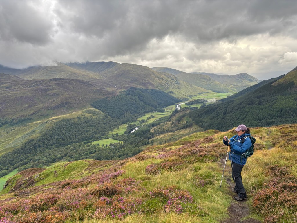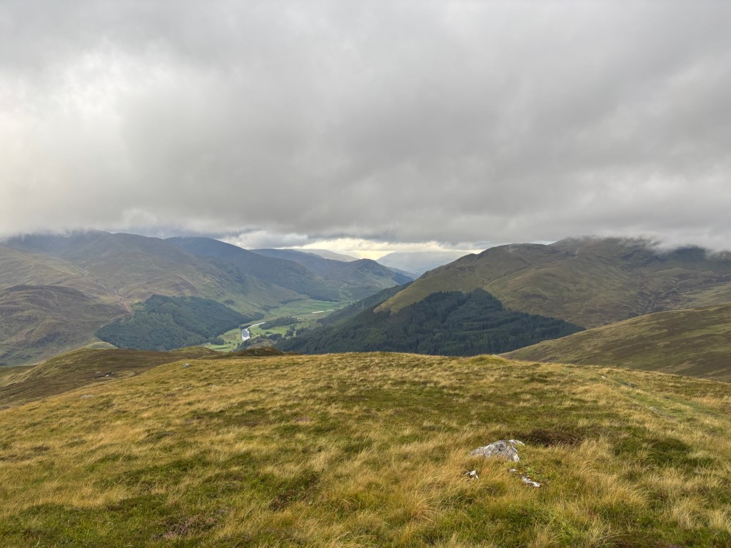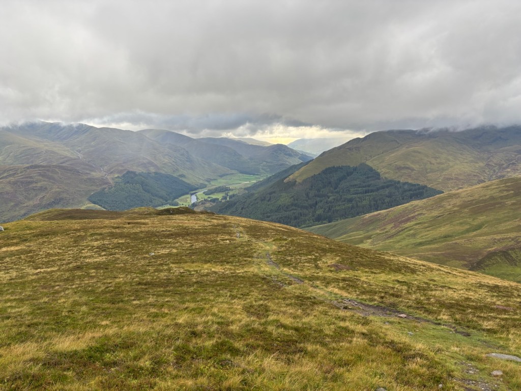 Early in our trip as a trio, I decided I would do only one more mountain hike: the four summits of Glen Lyon. The route is about 19 km with 1,330 meters of ascent (maybe more, since I also climbed the “tops” along the ridge). A 9.5-hour hike on Friday, August 29th — a day that started grey, turned misty, and then poured.