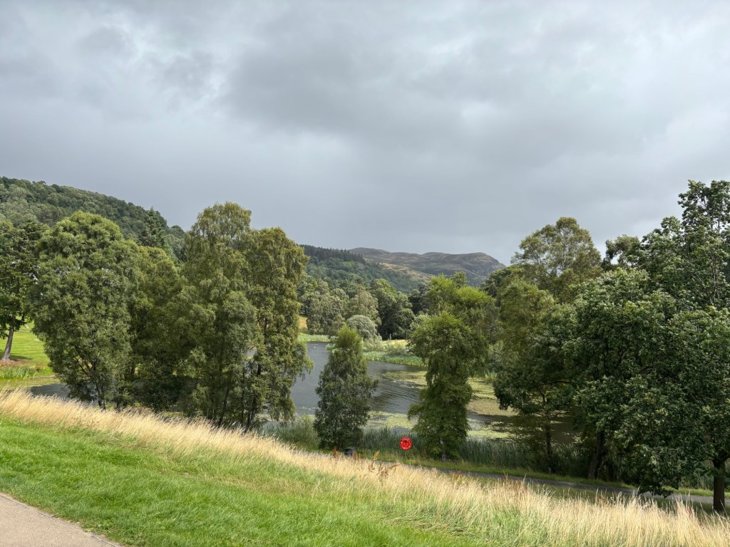 We had set the Satnav for Scone Palace. We followed its directions rather than looking for road signs – one being more predictable than the other. The turn toward the entrance was sharp, but nothing compared to the hair-raising one for Drummond Castle Gardens. We were following a car that seemed to know where it was going, so we didn’t worry, until we found ourselves right *in front* of the palace.
