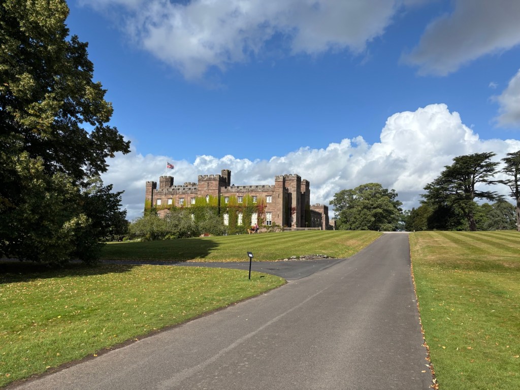Nous avions programmé le GPS vers le Palais de Scone. Nous suivions ses indications plutôt que de chercher des pancartes – l’un étant plus prévisible que l’autre. Le virage vers l’entrée était abrupt, mais rien d’énervant en comparaison avec l’entrée vers les jardins de Drummond Castle. On suivait un véhicule qui semblait savoir où aller, alors on ne s’en est pas fait jusqu’à ce qu’on atterrisse *devant* le palais…