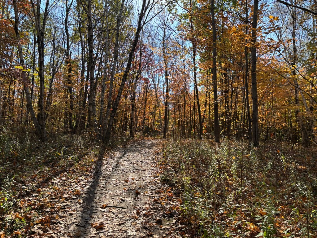 Cette année, l’automne au Québec est chaud et sec. Les feuilles se colorent. Les sentiers craquèlent. En l’absence d’eau, l’automne a un parfum de feu. Marcher au sec est facile et peut être agréable. Je préfère de loin la pluie froide d’octobre qui libère les odeurs d’humus et de feuilles qui retournent à la terre. Ces mêmes feuilles, durcies par la mort de la chlorophylle, contribuent de façon plus vive à la musique de la pluie. L’automne est à son meilleur sous l’ondée, et je rêve de journées pluvieuses pour marcher.